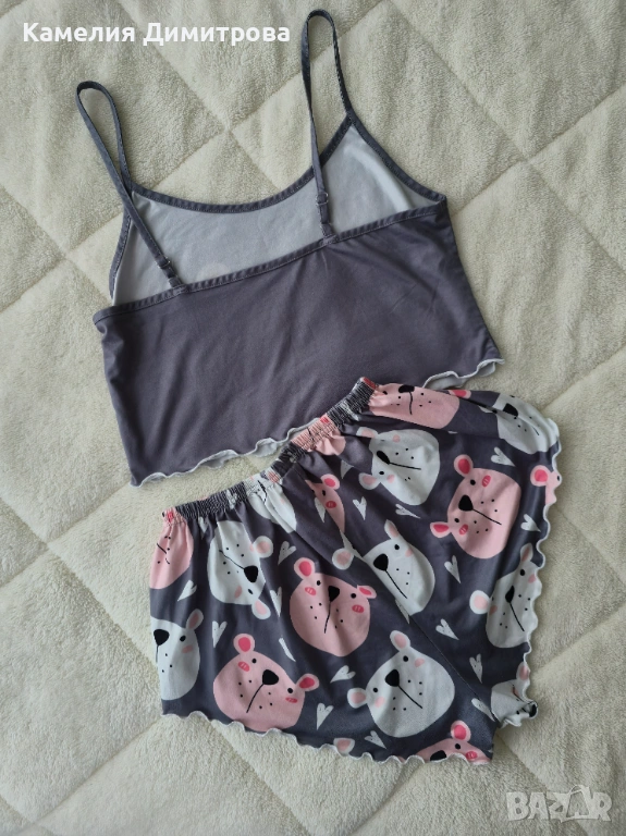 Дамски комплект за вкъщи – сив топ с мече + къси гащички → Обява 53285762