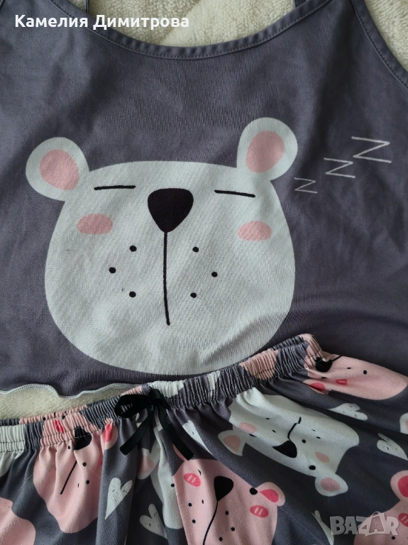 Сладък и удобен дамски комплект за сън или вкъщи. Състои се от сив къс топ с тънки презрамки и щампа на спящо мече отпред, комбиниран с къси гащички в същата гама с десен на мечета и сърчица.