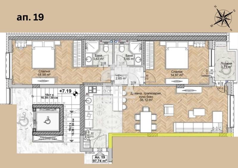 Апартаментът е с немски преход от дневния тракт към спалните помещения.