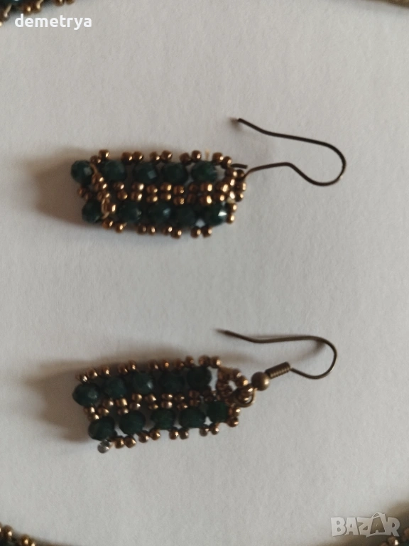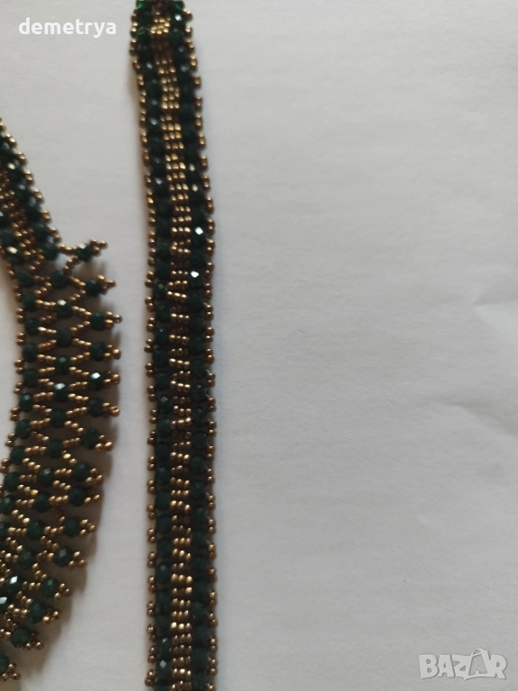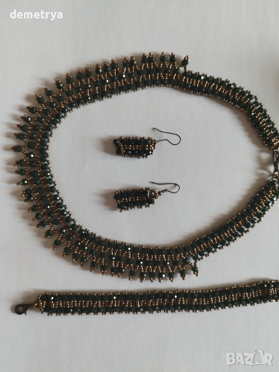 Комплект от колие, гривна и обеци, изработени от зелени и златисти камъни → Обява 53285926