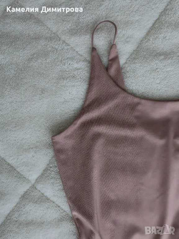 Модел с тънки презрамки и изчистено деколте, стои много женствено и нежно по тялото. Материята е гладка и мека, пада красиво и придава по-изискан вид дори на ежедневен аутфит. Долната част е тип боди, което го прави удобно за носене без да се набира. Леко е отшито в областта на копченцата, но това не пречи на закопчаването.
