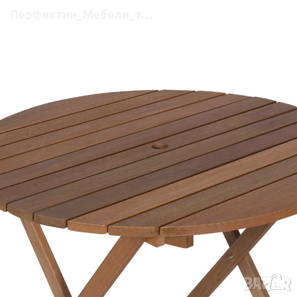 Сгъваема мобилна дървена кръгла(90см) маса за 6 човека с отвор за чадър