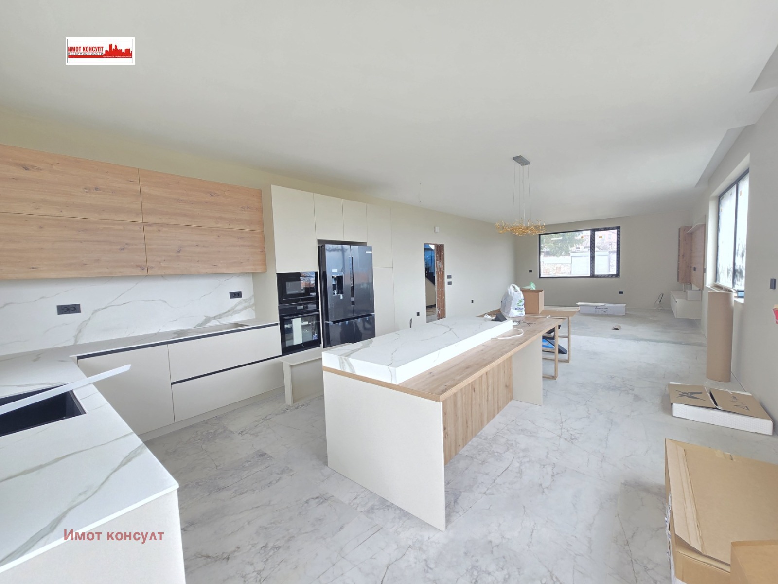 КУХНЯ - ТЕХНИЧЕСКИ КАМЪК - ЛАМИНАМ, ГОЛЯМ КУХНЕНСКИ ОСТРОВ, ГОЛЯМА ТРАПЕЗАРНА МАСА, ОТДЕЛНА ЗОНА СЪС СТОЛОВЕ ТИП ЩЪРКЕЛ ЗА КОКТЕЙЛИ.