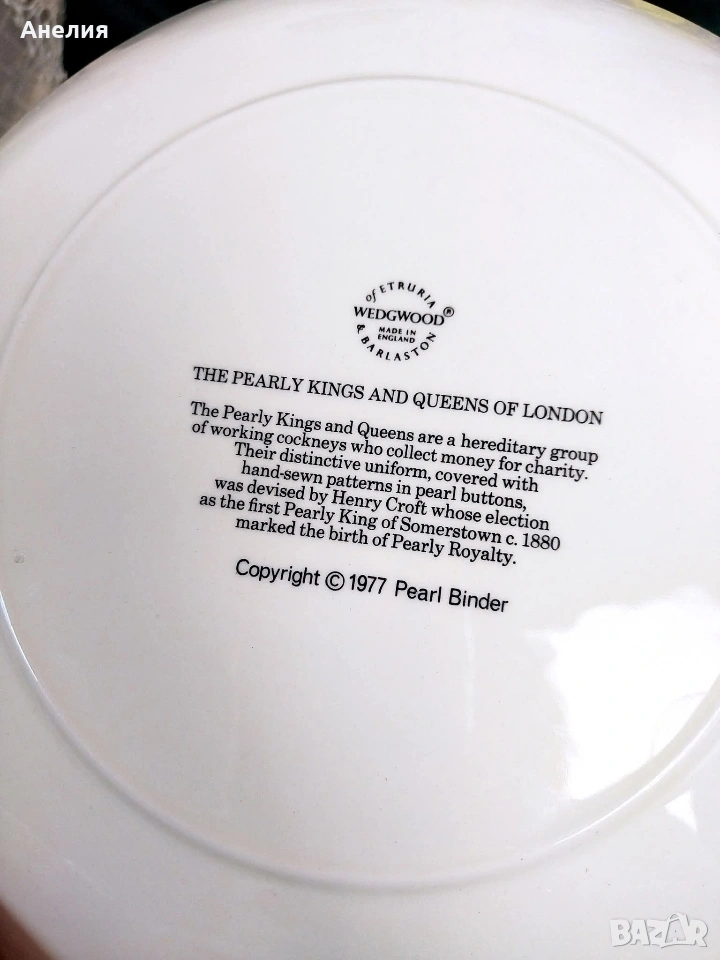 Производителят на чинията е Wedgwood, а авторските права са от 1977 г. на Pearl Binder.