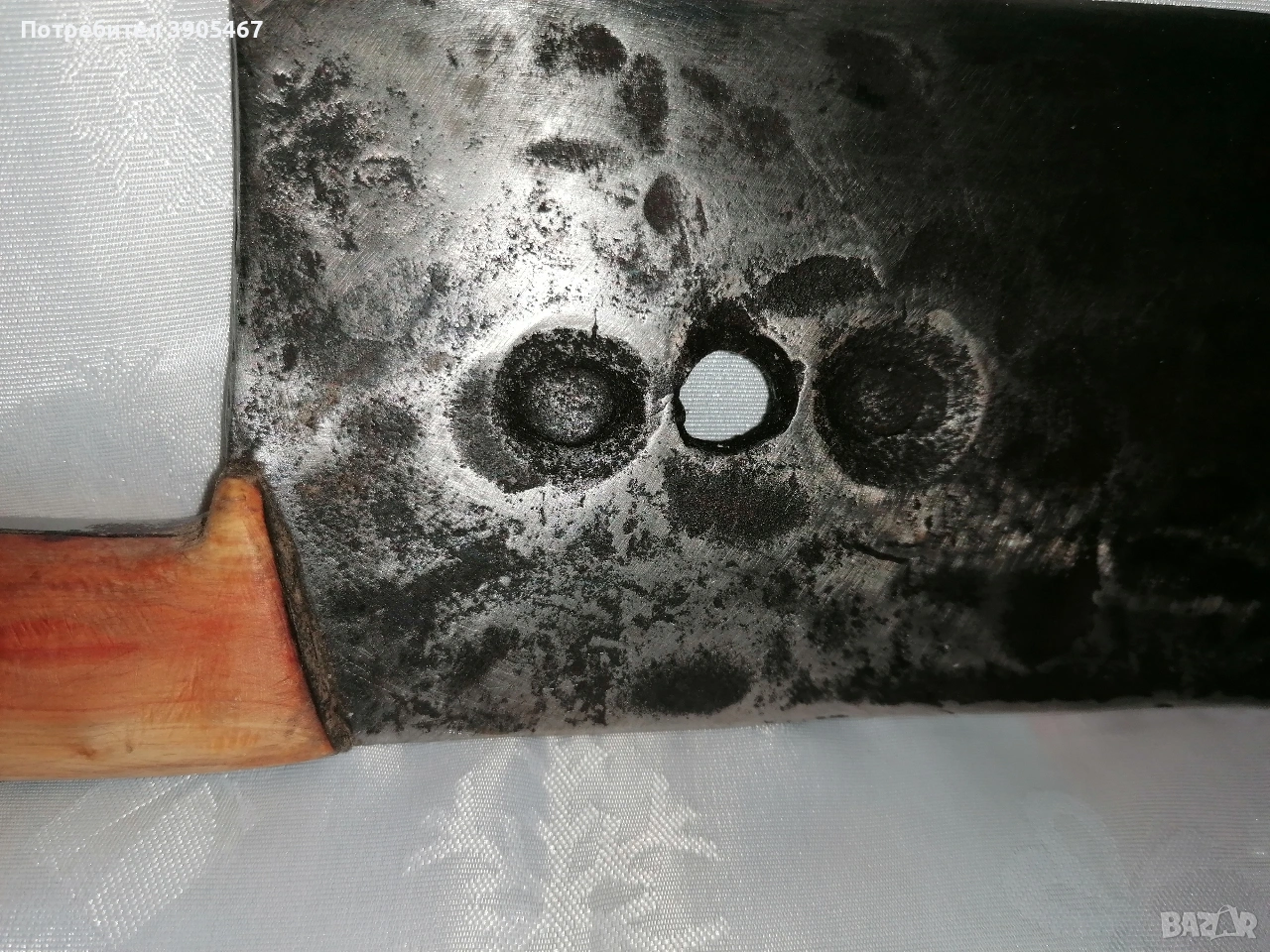 Този сатър наистина е много здрав и е професионално наточен. Има някакви печати. Дължина на острието - 20 см, обща дължина - 33 см, ширина - 9 см и дебелина - 6 мм. Тежи около 1350 грама / с домашно кантарче/, подходящ за професионално използване.