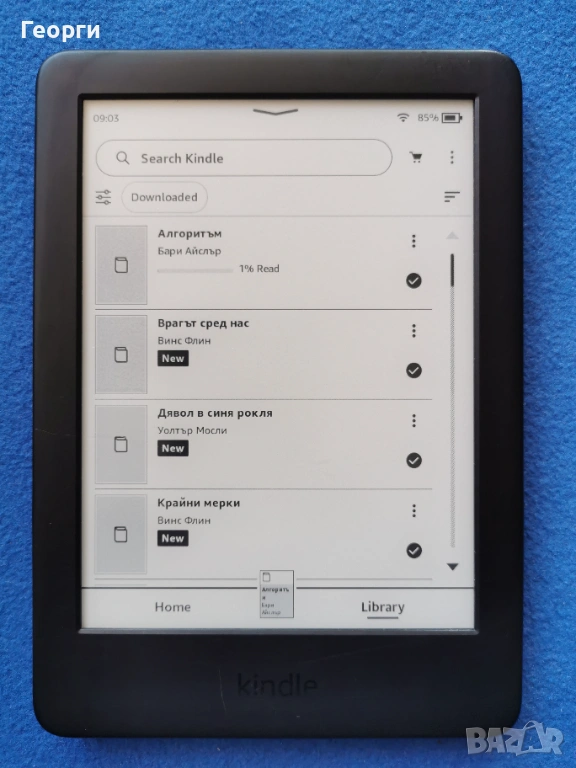 четец Kindle 10 Generation. Има дребни драскотинки, нищо особено не са (вижте снимките, ще добиете представа), работи всичко както трябва, без проблеми. Няма зарядно и кабел, зарежда се с micro USB, от телефони става. Има WiFi и Bluetooth.Може да се свалят книги директно от Интернет.