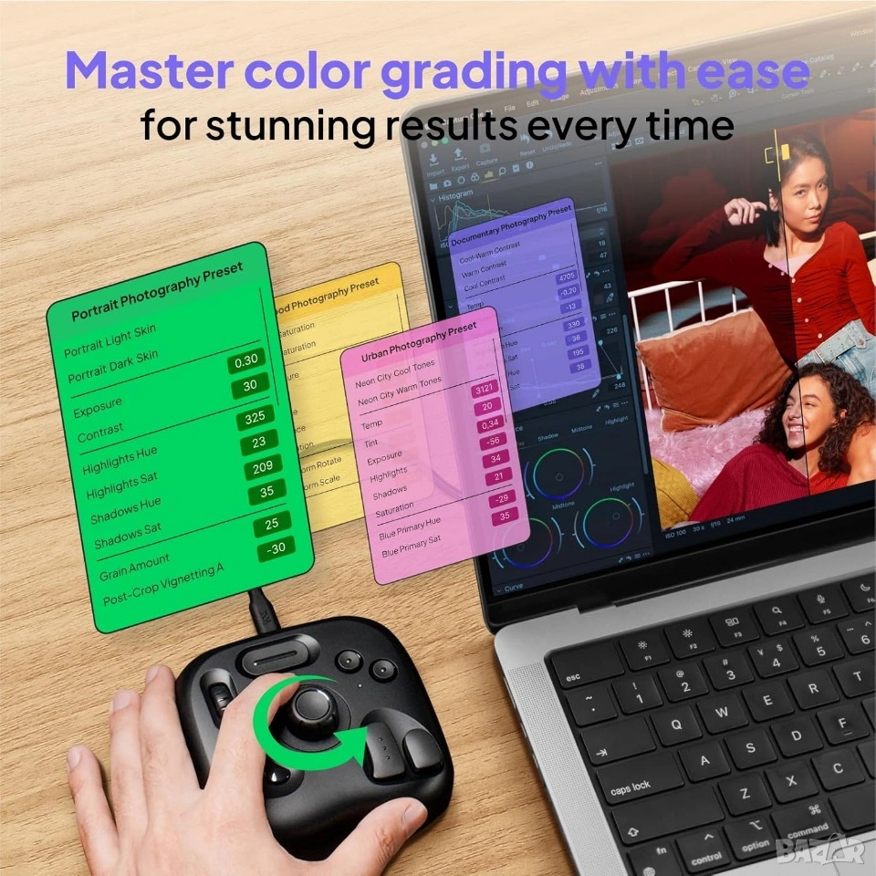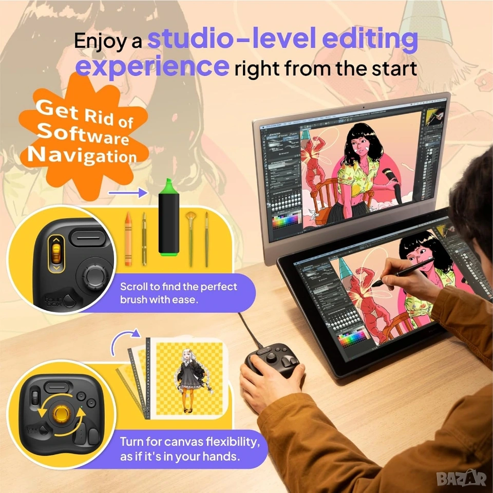 * Дълбока персонализация (TourMenu): Софтуерът на TourBox позволява създаването на персонализирани менюта и макроси, както и автоматично превключване на профилите според активната програма.