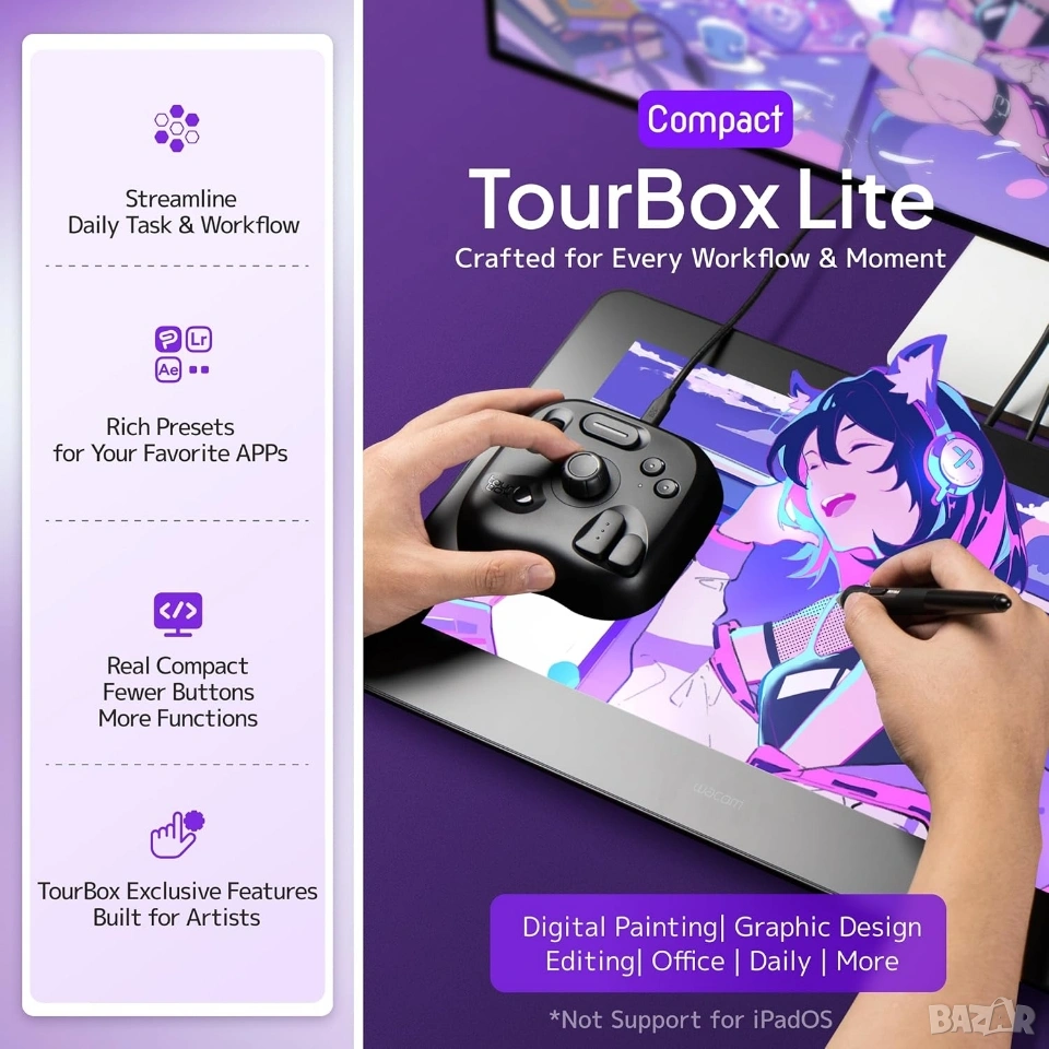 TourBox Lite е специализиран хардуерен контролер, проектиран да оптимизира и ускори работния процес на дигитални творци, фотографи, илюстратори и видео монтажисти. Устройството е създадено за работа с една ръка, като допълва използването на мишка или графичен таблет. Чрез своята ергономична подредба и различни по форма бутони, TourBox Lite позволява интуитивен контрол "без зрителен контакт" (Eye-Free Control), което дава възможност на потребителя да остане напълно фокусиран върху екрана и творческия процес. Това е идеалният инструмент за тези, които търсят ефективност и прецизност при работа със софтуер за обработка.