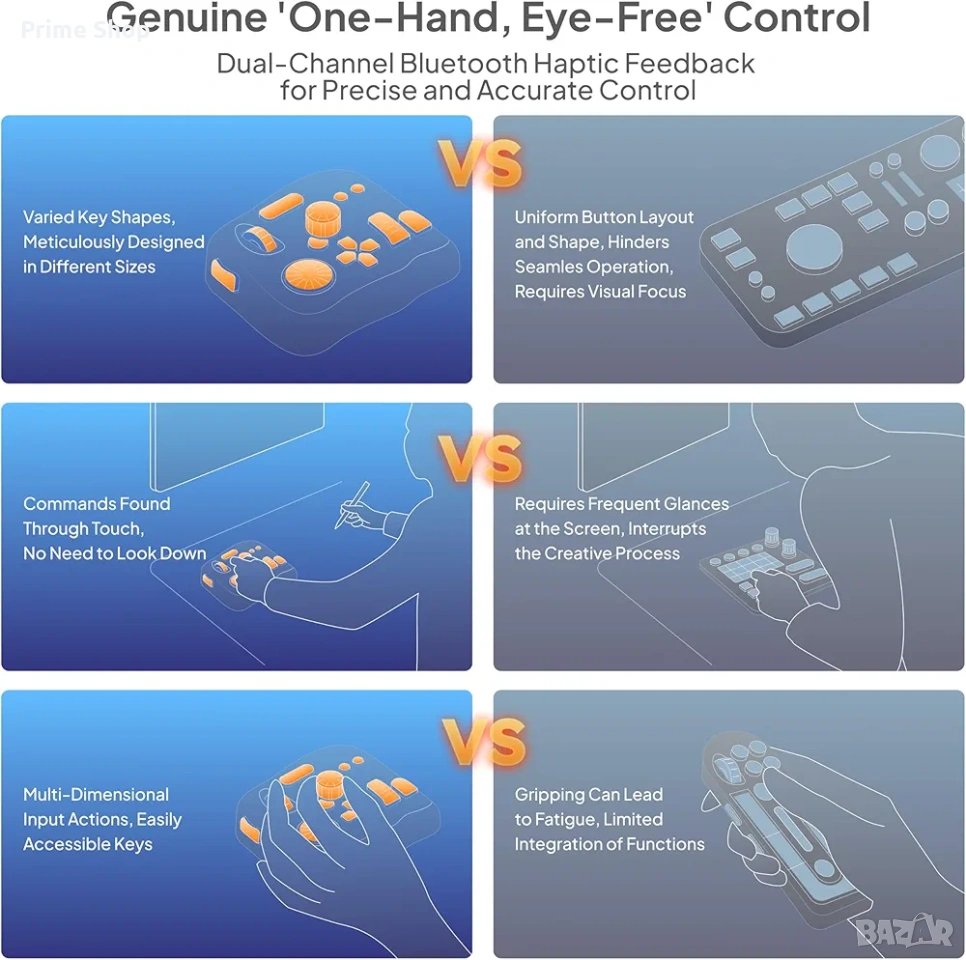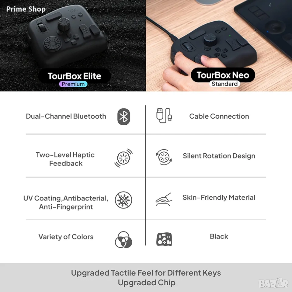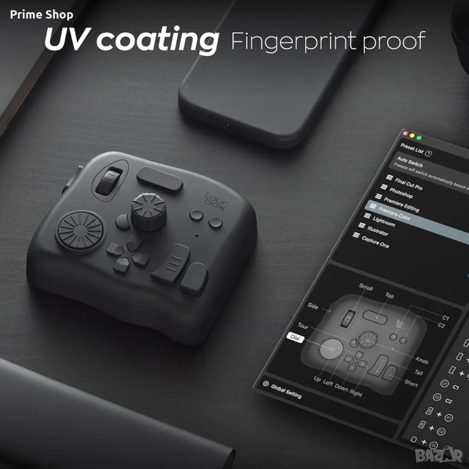* Пълна персонализация (TourBox Console 5): Софтуерът позволява конфигуриране на всеки бутон. Поддържа създаване на макроси, комбинирани команди и уникални менюта върху екрана за максимална продуктивност. Само с 14 физически бутона можете да управлявате над 100 функции чрез различни пресети.