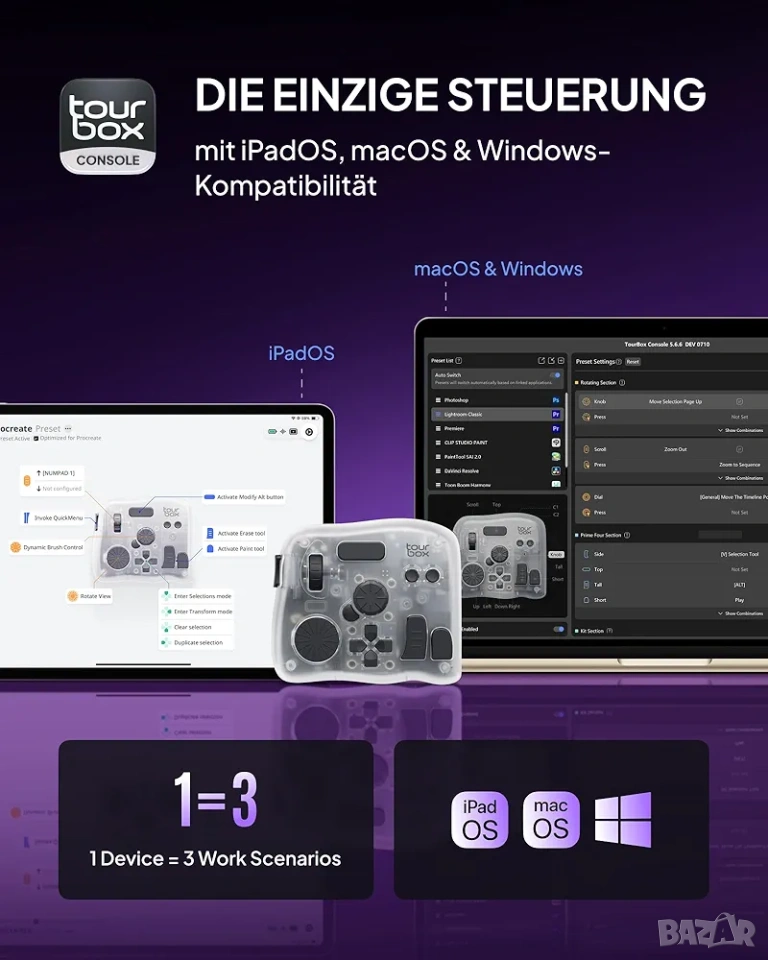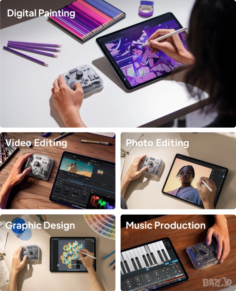 TourBox Elite Plus, графичен контролер, конзола за ретуш, iPad аксесоари за рисуване, видео монтаж клавиатура, Procreate контролер, Lightroom периферия, шорткът клавиатура, Adobe Photoshop контролер, DaVinci Resolve конзола.
