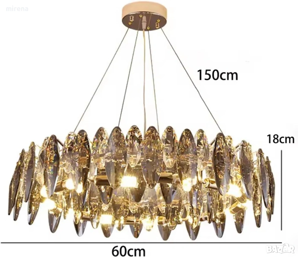 Изящна кристална полилейна лампа, подходяща за ресторант, вила или друго помещение с висок таван. Лампата е с диаметър 60 см и височина 150 см, с множество кристални елементи, които създават красиво и ефектно осветление.