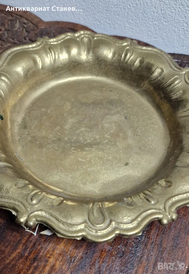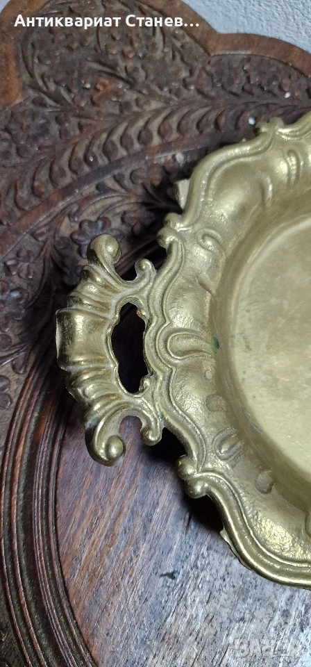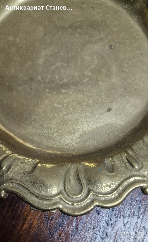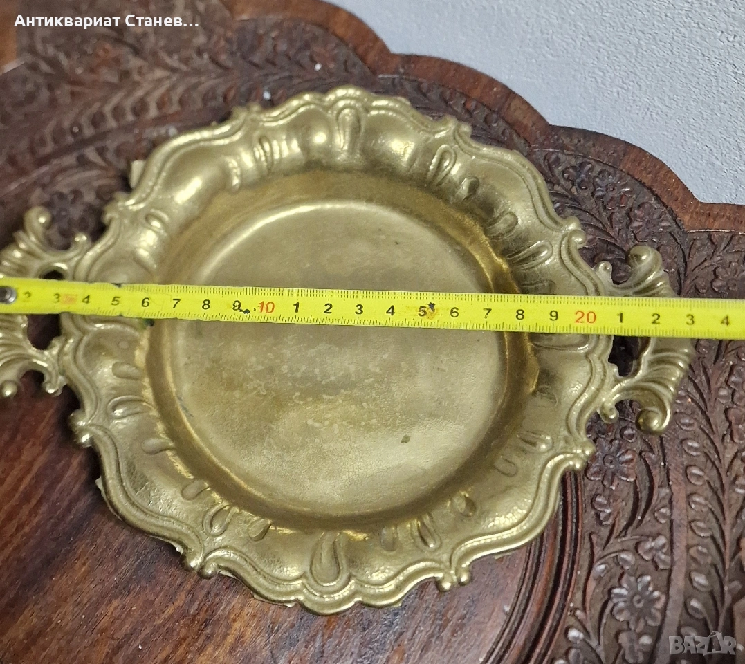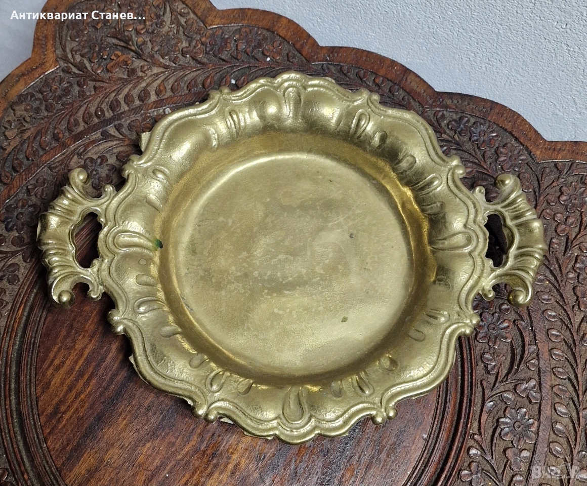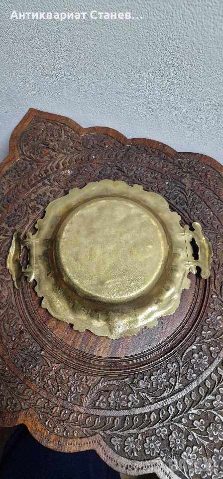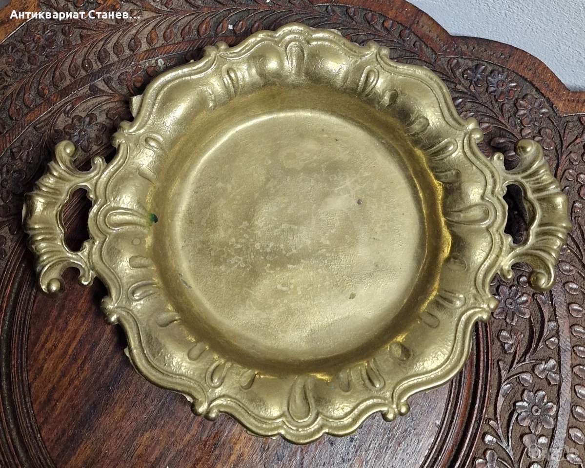 Елегантна месингова чиния с две орнаментирани дръжки, изработена от плътен месинг. Отличава се с красива, вълнообразна форма и автентична патина, придаваща характер и усещане за старинност. Стабилна, тежка и с присъствие – истински винтидж акцент.
