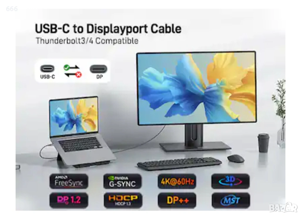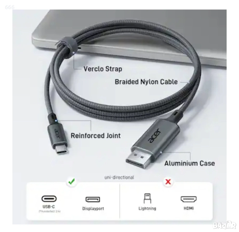 Acer - USB C към DisplayPort кабел 10 фута (4K@60HZ 2K@165Hz), Type-C към DisplayPort кабел - сив → Обява 53288640