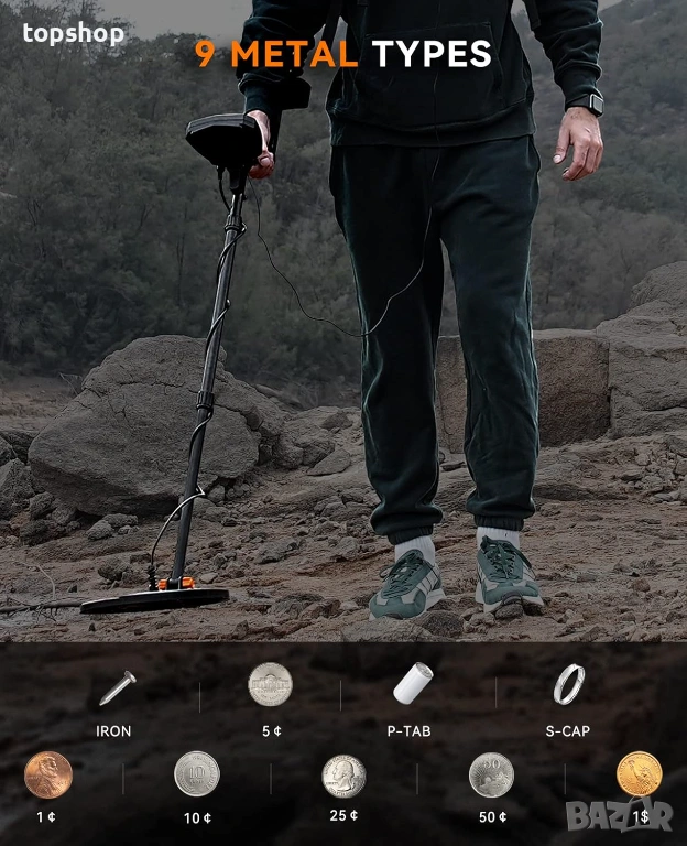 Забележка: Продава се само металотърсачът (без слушалки). Има стандартен изход за слушалки и вграден силен говорител.