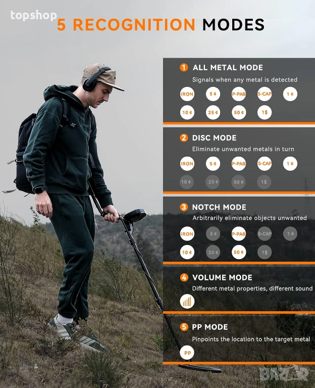5 Режима на работа: Включително DISC (филтриране на боклуци) и NOTCH (избор на конкретен метал).