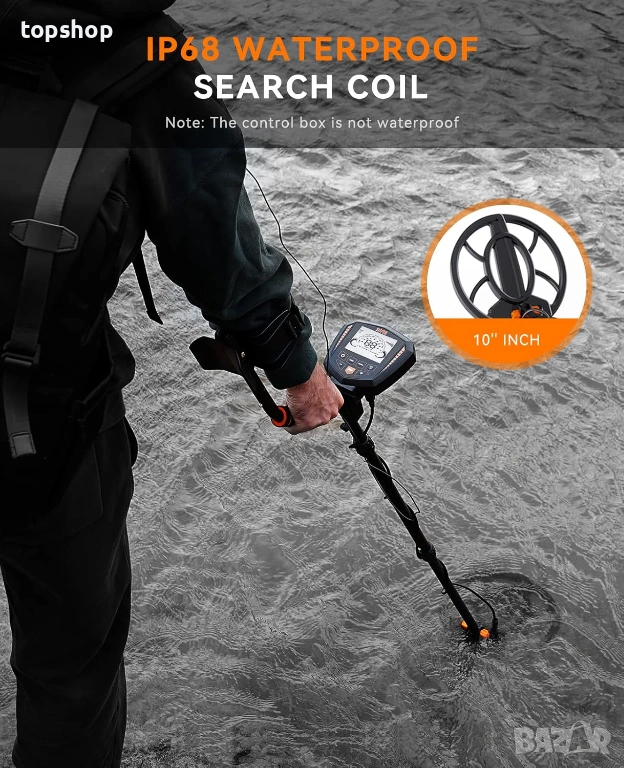10-инчова IP68 сонда: Напълно водоустойчива за търсене в плитки води, реки и морския бряг.