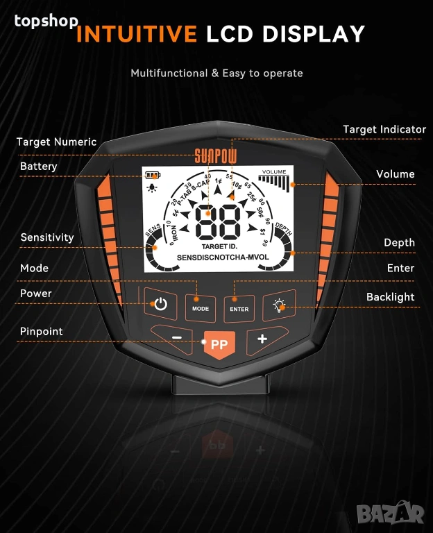 Голям LCD дисплей: Показва точно какъв метал сте открили чрез 9 различни икони и цифрова стойност.