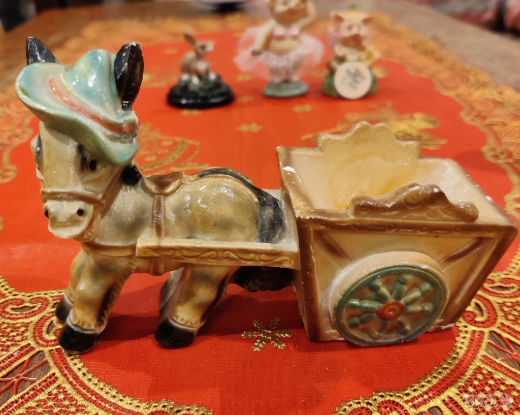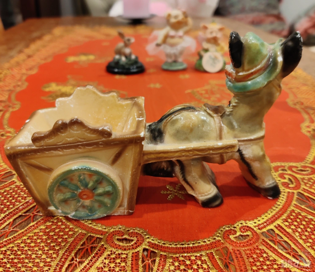 Магаре с каручка Италия. Височина 10 ширина 15 см. Цена 15 евро. Мече фея ново Regensy Art, височина 7 ширина 5 см. Цена 10 евро. Мече балерина височина 8 ширина 6 см. Цена 10 евро. Зайче на дървена подложка, височина 6 ширина 6 см. Цена 10 см.
