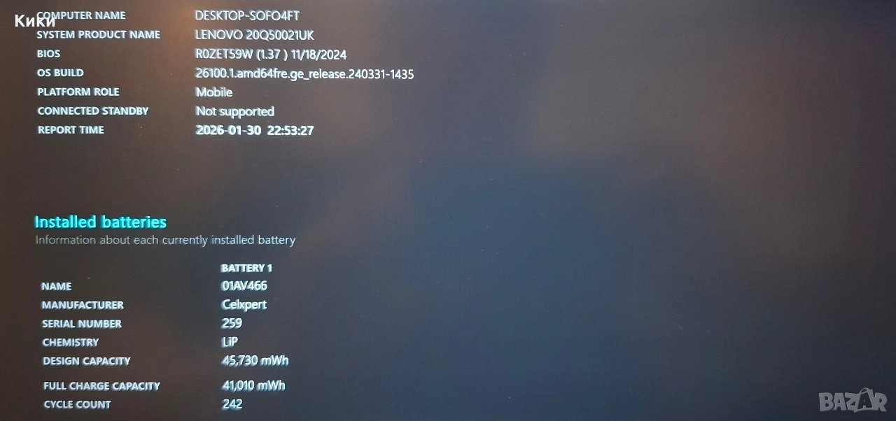 Лаптопа е перфектен технически. Батерията е над 90% издържа доста часове.Има козметични забележки три цепки по корпуса които са нормални за модела. Оборудван е с бърз процесор 8GB рам и бързо ssd.Подходях е за всякакви дейности и тежки програми.