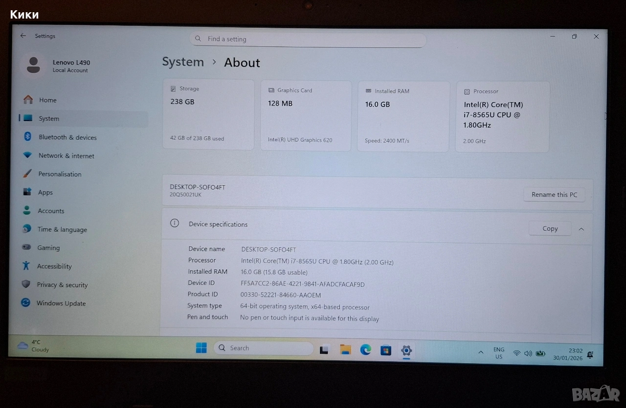 Лаптоп Lenovo ThinkPad L490 | I7 8565U | 8GB | 256 SSD, снимка 1 - Лаптопи за работа - 53289626 Лаптоп Lenovo ThinkPad L490 | I7 8565U | 8GB | 256 SSD, снимка 2 - Лаптопи за работа - 53289626 Лаптоп Lenovo ThinkPad L490 | I7 8565U | 8GB | 256 SSD, снимка 3 - Лаптопи за работа - 53289626 Лаптоп Lenovo ThinkPad L490 | I7 8565U | 8GB | 256 SSD, снимка 4 - Лаптопи за работа - 53289626 Лаптоп Lenovo ThinkPad L490 | I7 8565U | 8GB | 256 SSD, снимка 5 - Лаптопи за работа - 53289626 Лаптоп Lenovo ThinkPad L490 | I7 8565U | 8GB | 256 SSD, снимка 6 - Лаптопи за работа - 53289626 Лаптоп Lenovo ThinkPad L490 | I7 8565U | 8GB | 256 SSD, снимка 7 - Лаптопи за работа - 53289626 1/7