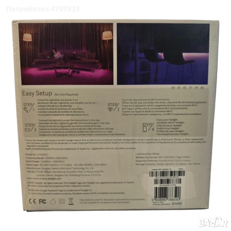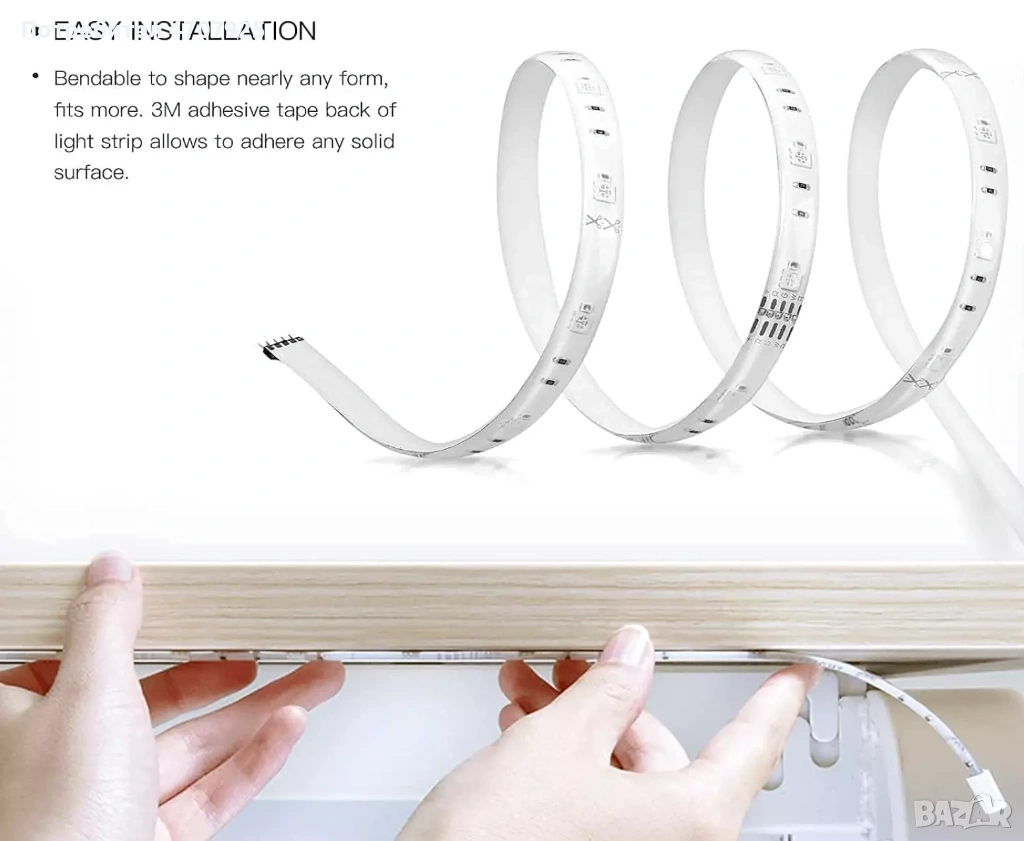 LED лентата се управлява лесно чрез мобилното приложение Yeelight или с гласови команди, благодарение на съвместимостта с Amazon Alexa, Google Assistant и Apple HomeKit. Не е необходим допълнителен хъб – свързва се директно чрез Wi-Fi (2.4 GHz).
