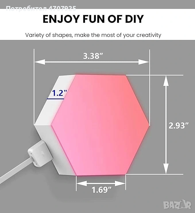 Хексагоналните стенни светлини имат елегантен дизайн. Всеки панел е с размер 3,14 инча в диаметър, 1,2 инча ширина и 2,94 инча височина, с тегло само 52,5 г. Проектирани са за монтаж както на стена, така и върху бюро, което ги прави изключително гъвкави за декорация.