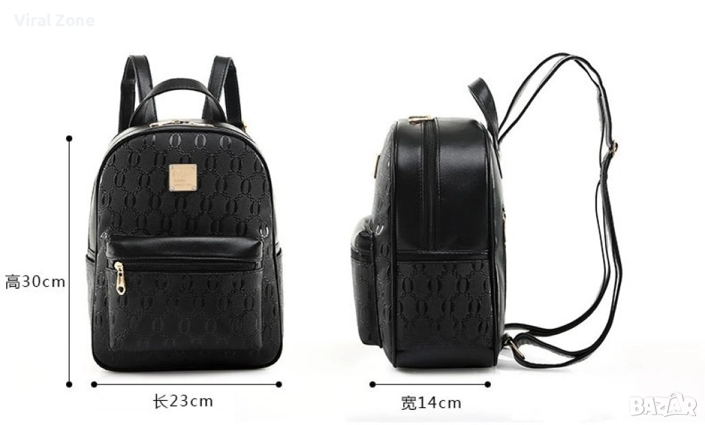 Размер: раница: ширина - 23 см, височина - 29 см, ширина на долната част - 13 см, дължина на презрамката - 84 см.