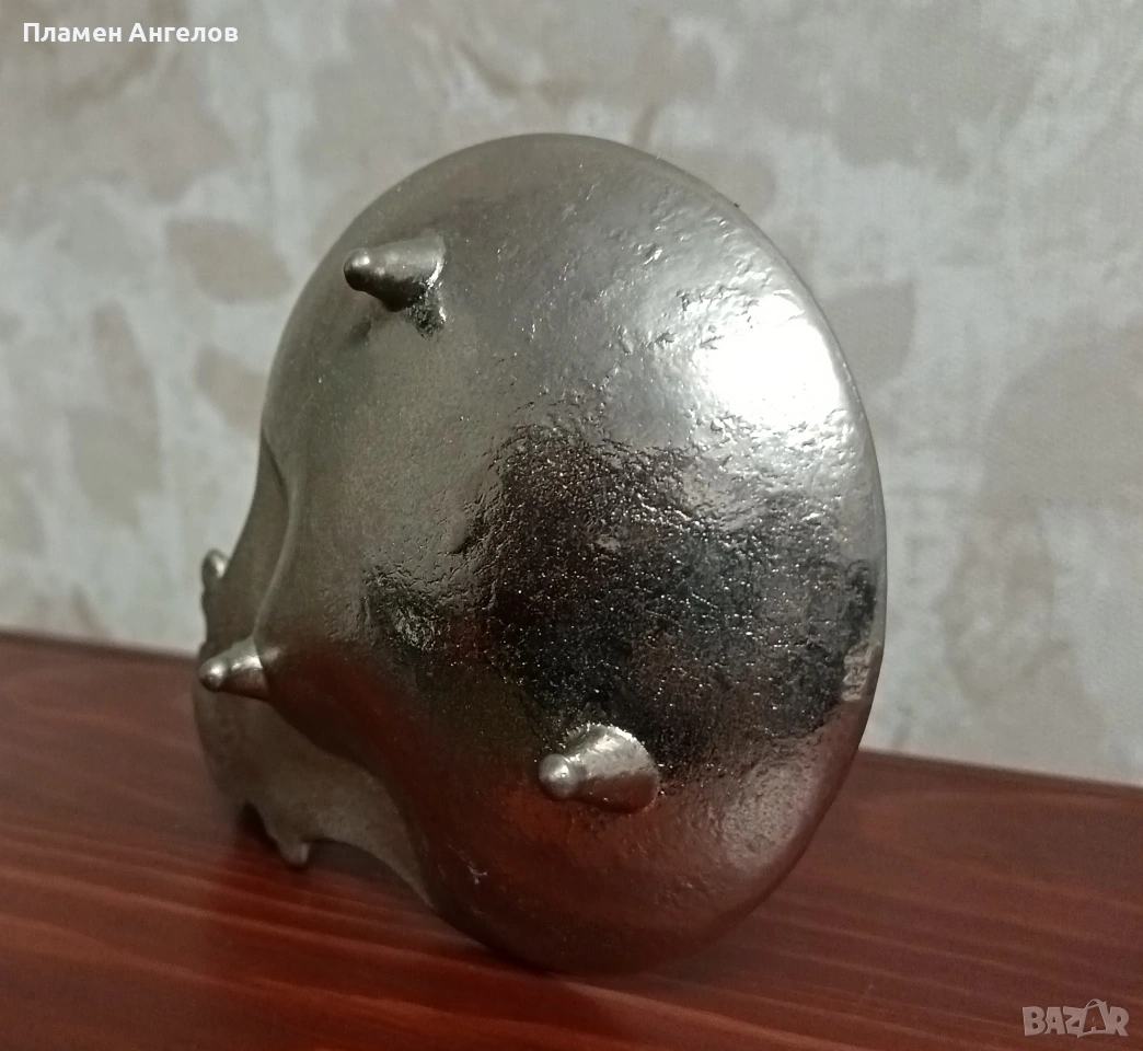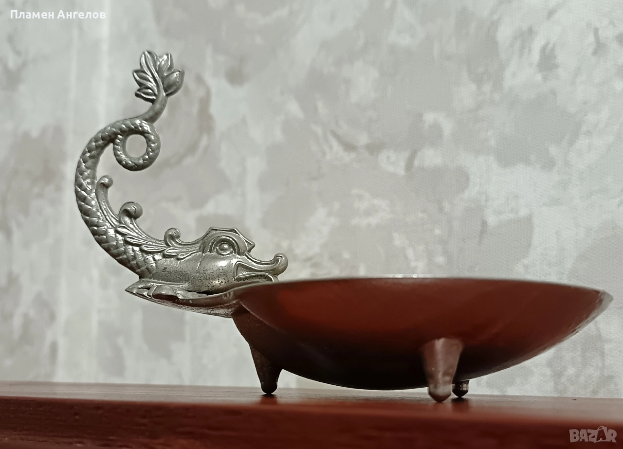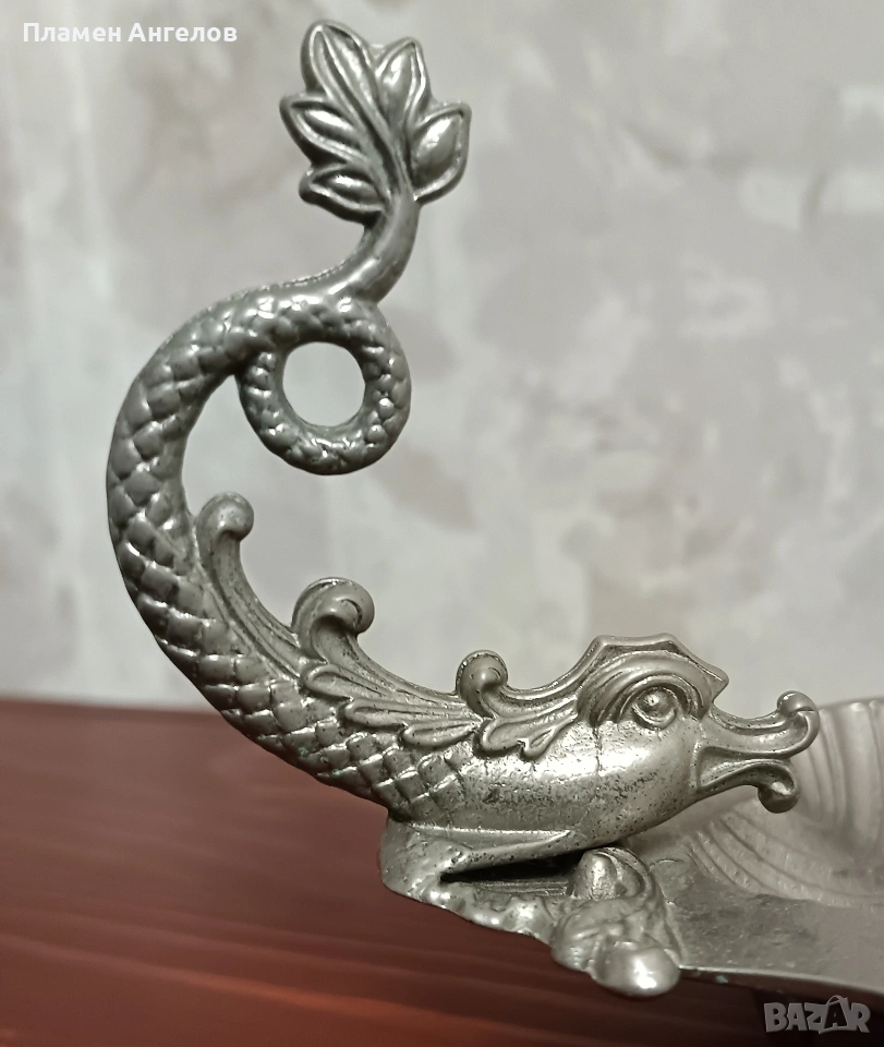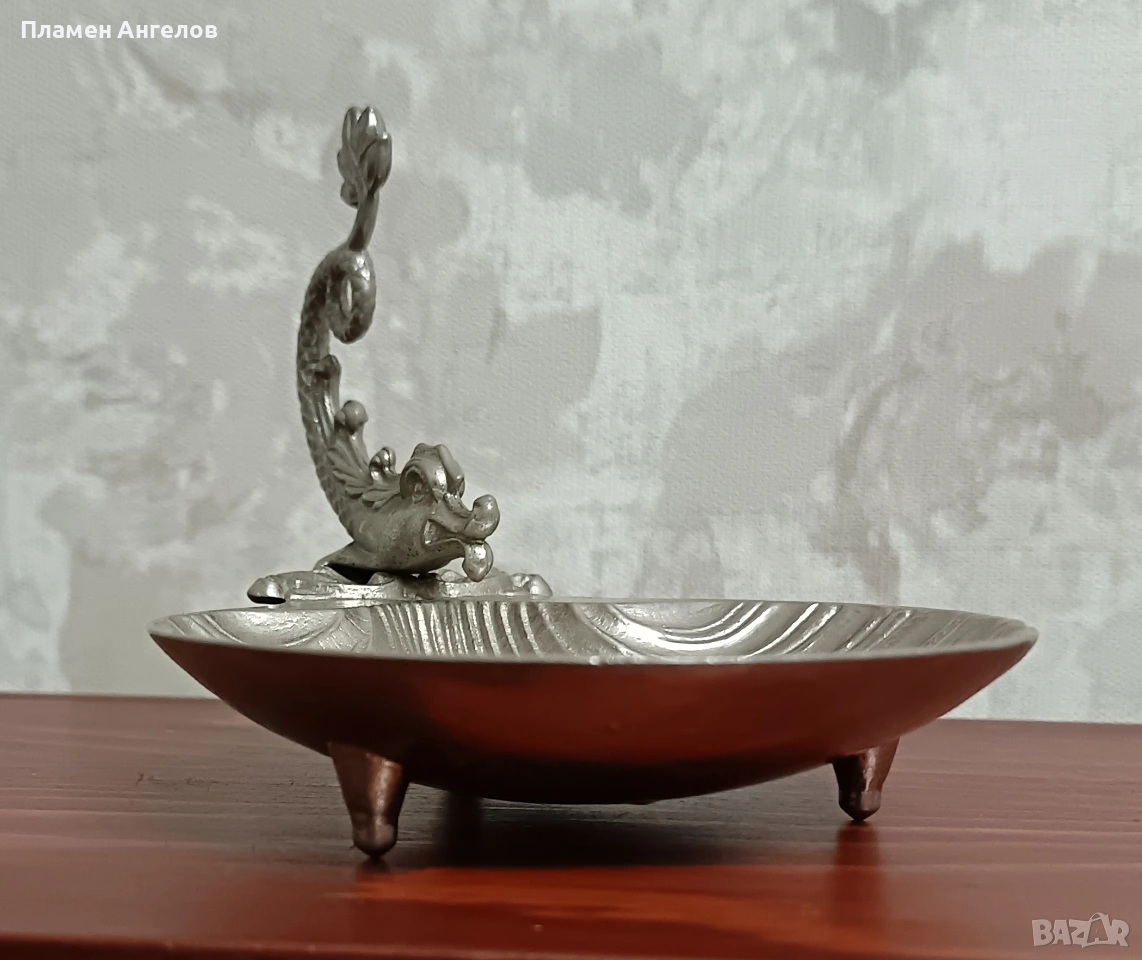 Винтидж месингова купа, съд във формата на мида със сребристо покритие и с декоративна дръжка-основа с мотив на водно, морско конче или дракон. С размери 15×12см. Произведено от Sheffield-Home в бароков/рококо/ стил. Най-често се употребяват като купички за бижута, ключове, за дребни предмети, дори за сапунерка. Произведени. от края на 19 до средата на 20 век.