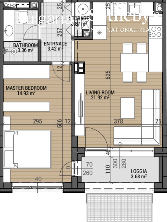 Разпределение: Дневен тракт с кухня, спалня, баня с тоалетна, склад, лоджия.