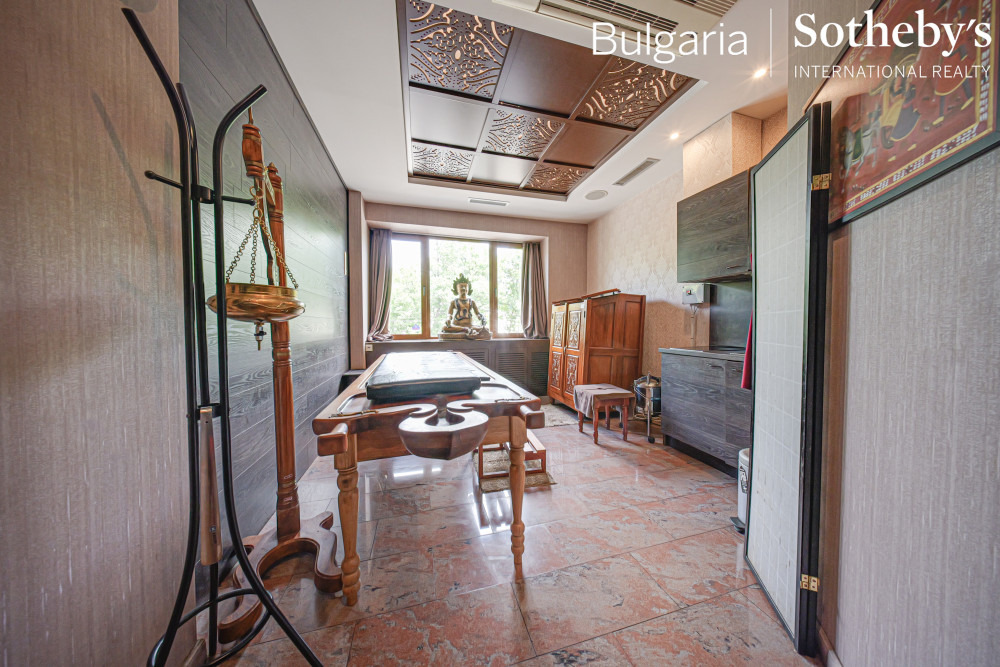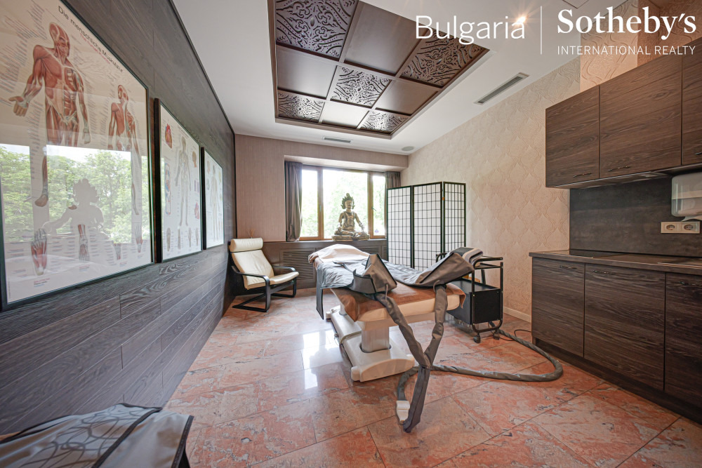 Просторното вътрешно разпределение включва четири големи стаи, три от които със собствени бани и тоалетни, голям коридор с престижна рецепция, кухня, санитарно помещение, луксозен офис и мазе