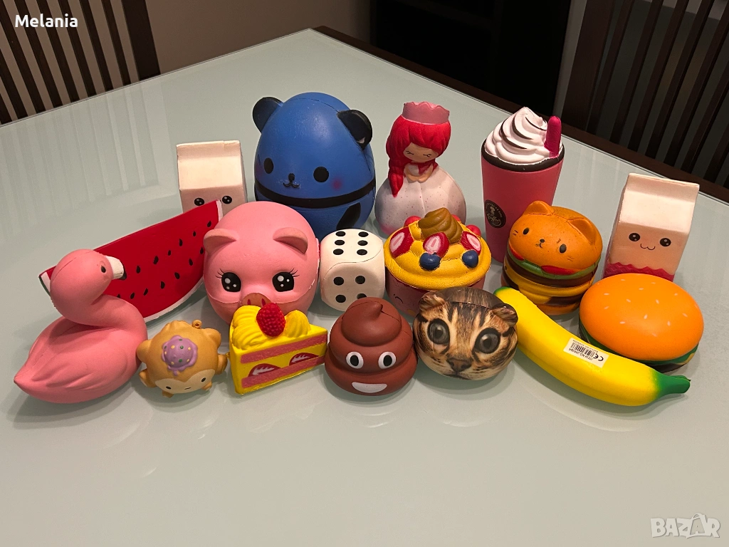 47 броя скуишита – различни модели, цветове и форми (храна, животинки, герои).