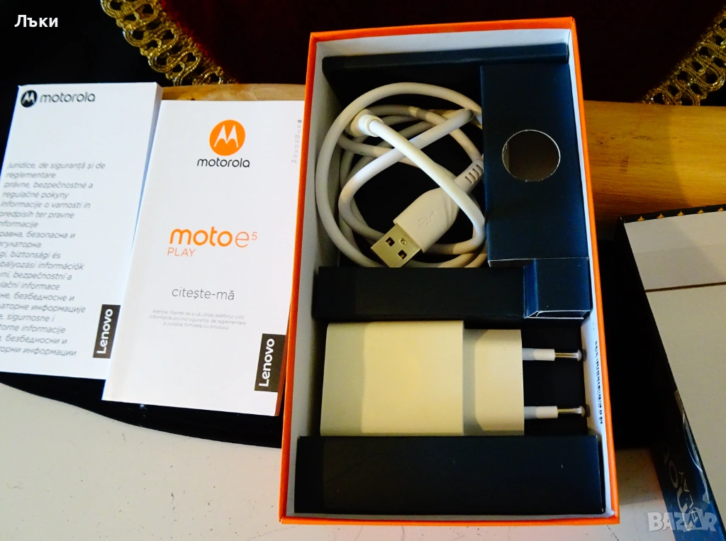 moto e5 play с кабел за зареждане и оригинално зарядно,инструкции за есплоатация,оригинална