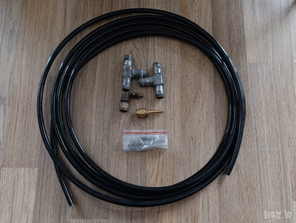 Комплекта е пълен: копче, МАР сензор, целия кабелаж от двигателния отсек. Трябват само бутилка и маркучи и е готов за монтиране на вашата кола.