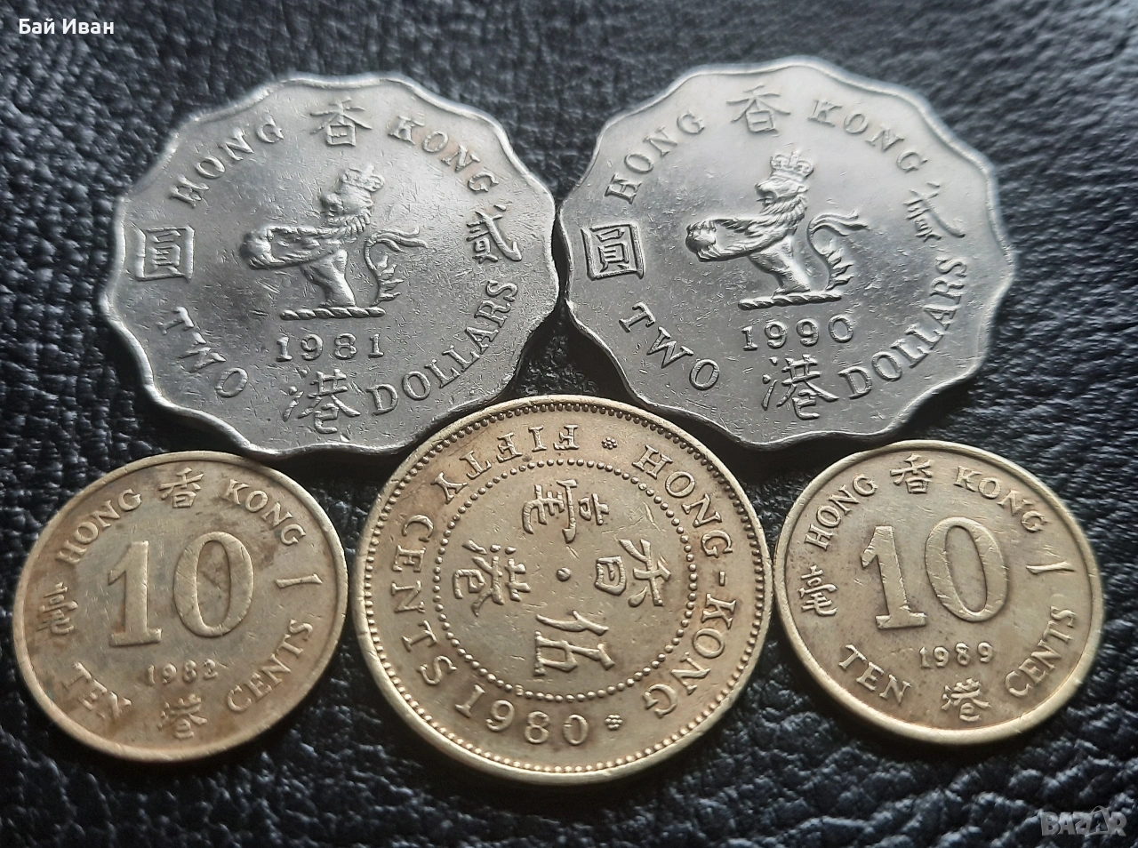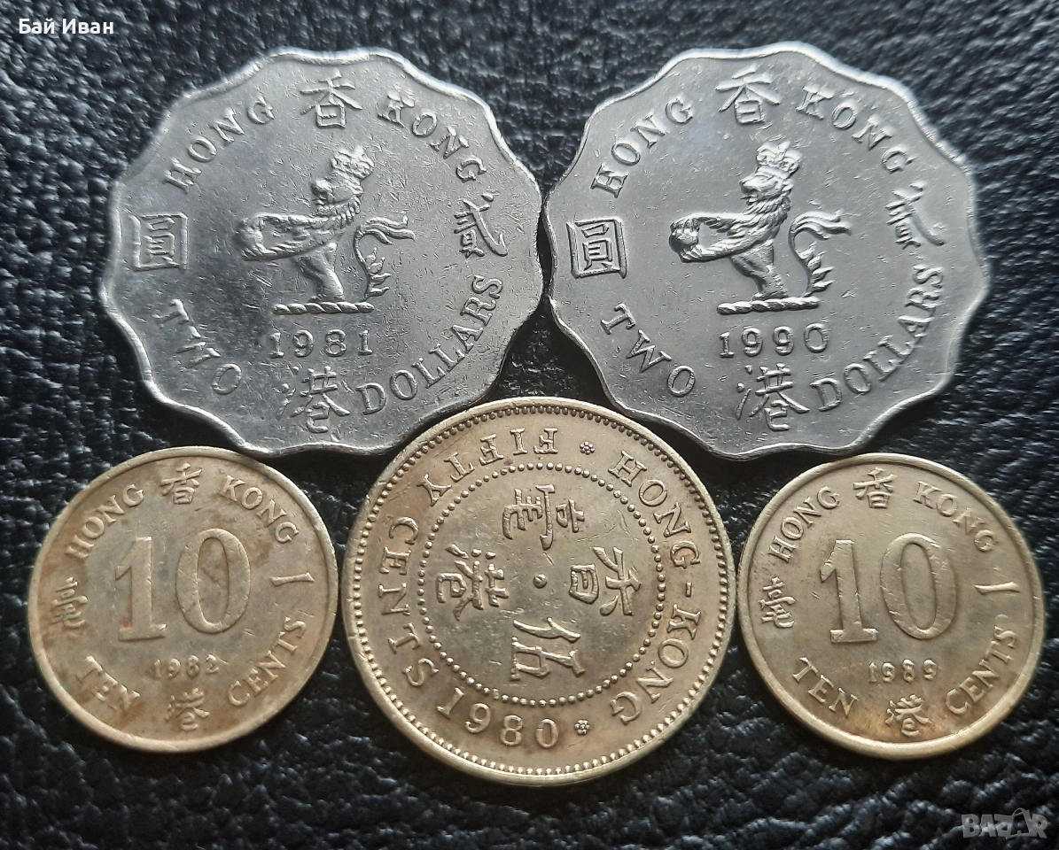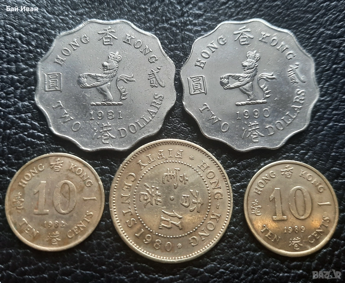 Цената е общо за всичките. Лота включва : 10 цента 1982 г. 10 цента 1989 г. 50 цента 1980 г. 2 долара 1981 г. и 2 долара 1990 г. Хонг Конг. Разгледайте и другите ми обяви-има какво да се види ! Моят съвет е-поръчайте си няколко мои артикула,така спестявате от доставка -с една доставка няколко неща !