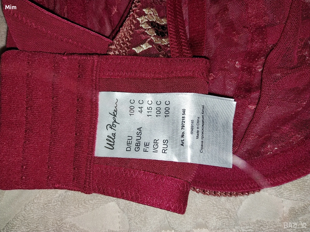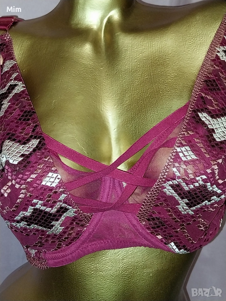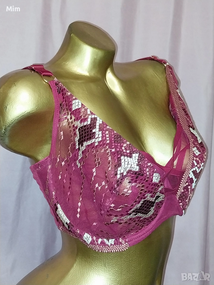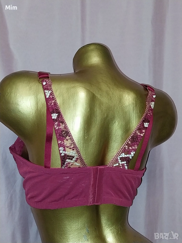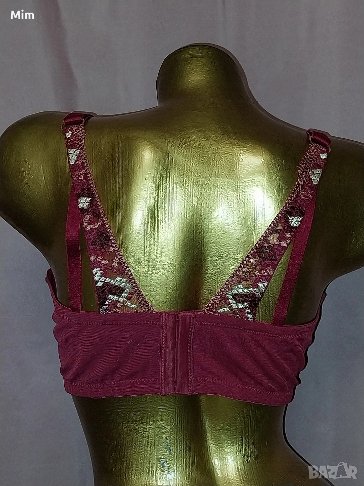 Чашката е мека от дантела на мотиви и тънка подплата, регулируеми презрамки четириредово закопчаване подгръдна до 120 см еластичност Няма забележки или следи от употреба.
