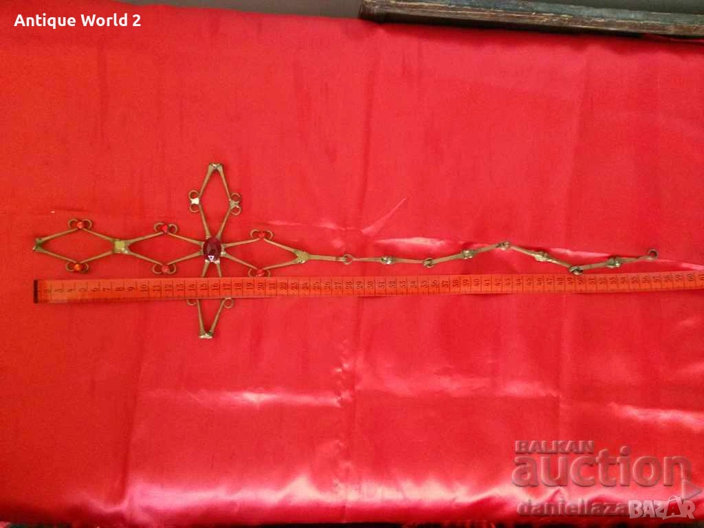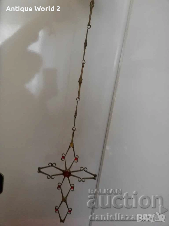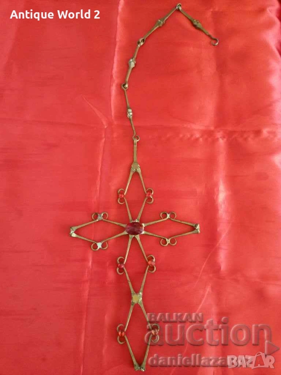 Красив Стар Голям Бронзов Висящ Църковен КРЪСТ с Камъни със Синджир за Окачване .