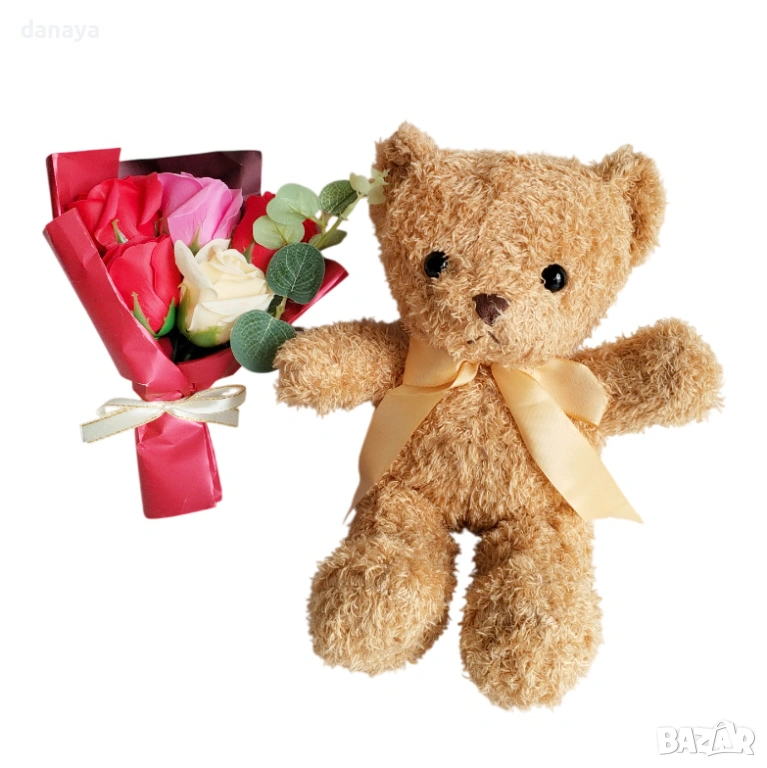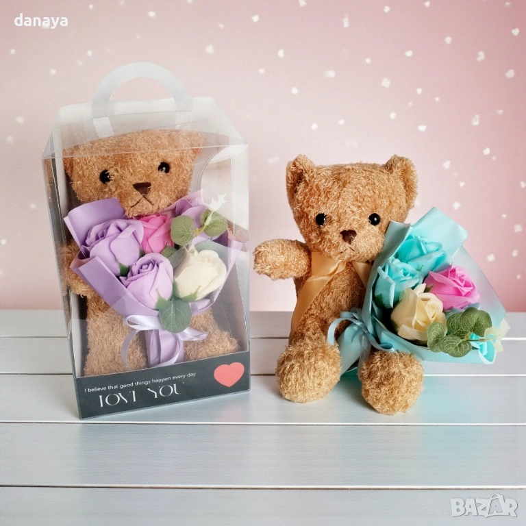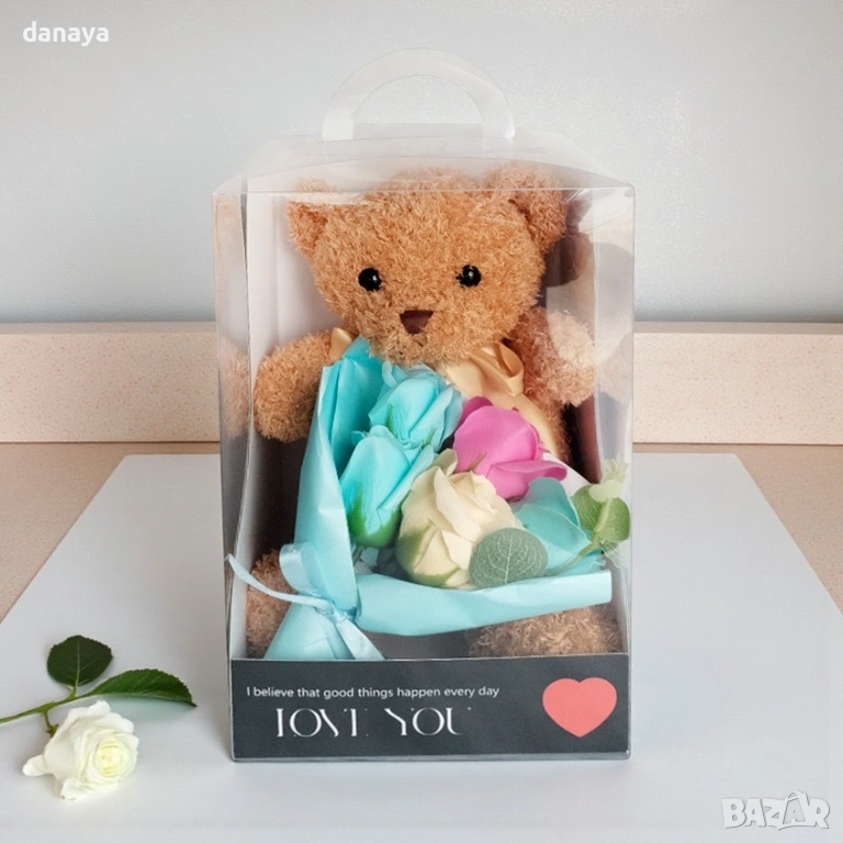 Плюшеното мече е съчетано с красиво аранжиран букет от ароматизирани изкуствени рози, които излъчват фин и нежен аромат. Комплектът е поставен в прозрачна подаръчна кутия с дръжка, което го прави напълно завършен романтичен подарък, без нужда от допълнително опаковане.
