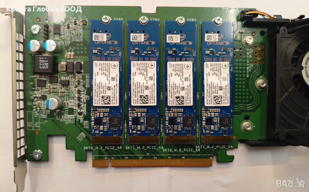 Продавам готова останала от неизпълнен проект конфигурация за екстремно ускорение на дискови масиви (ZFS, vSAN, Storage Spaces). Картата е оборудвана с 5 броя Intel Optane M10 16GB, като 4 са монтирани, а 1 е включен като резерва (Cold Spare).