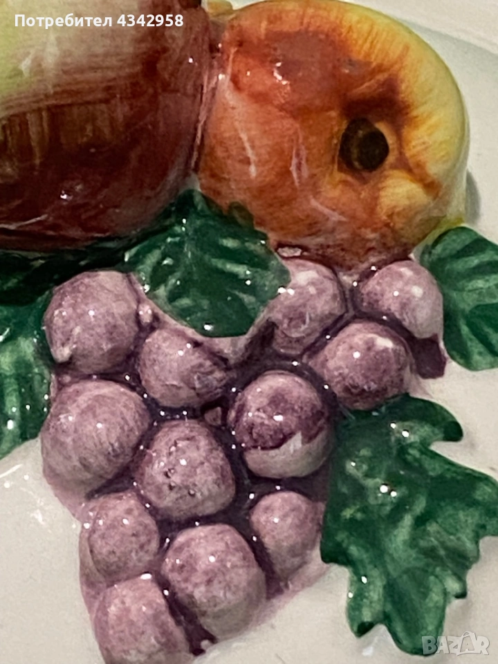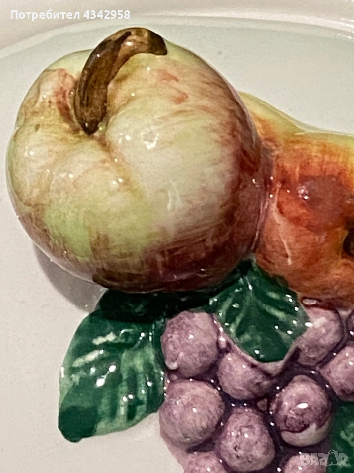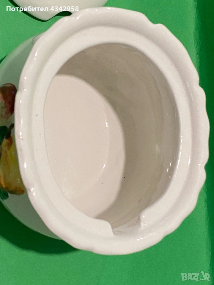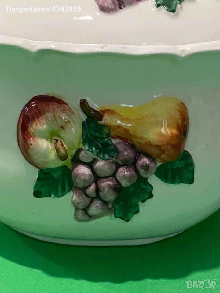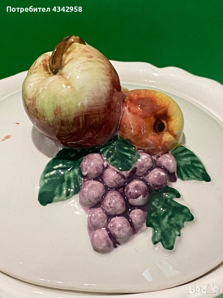 Красив винтидж съд за сладко или захарница от порцелан с релефна декорация на плодове. Подходящ както за сервиране, така и като декоративен акцент в кухня в селски или ретро стил.