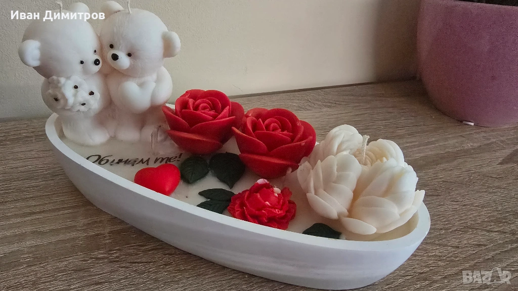 Красива декоративна ароматна свещ с фигурки на прегърнати мечета с рози - идеален подарък за любим човек. Свеща е изработена от соев восък и висококачествени материали. Цената е намалена поради тава, че има малък, почти незабележим ефектен дефект на розите който се вижда на снимките.