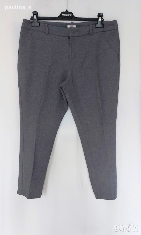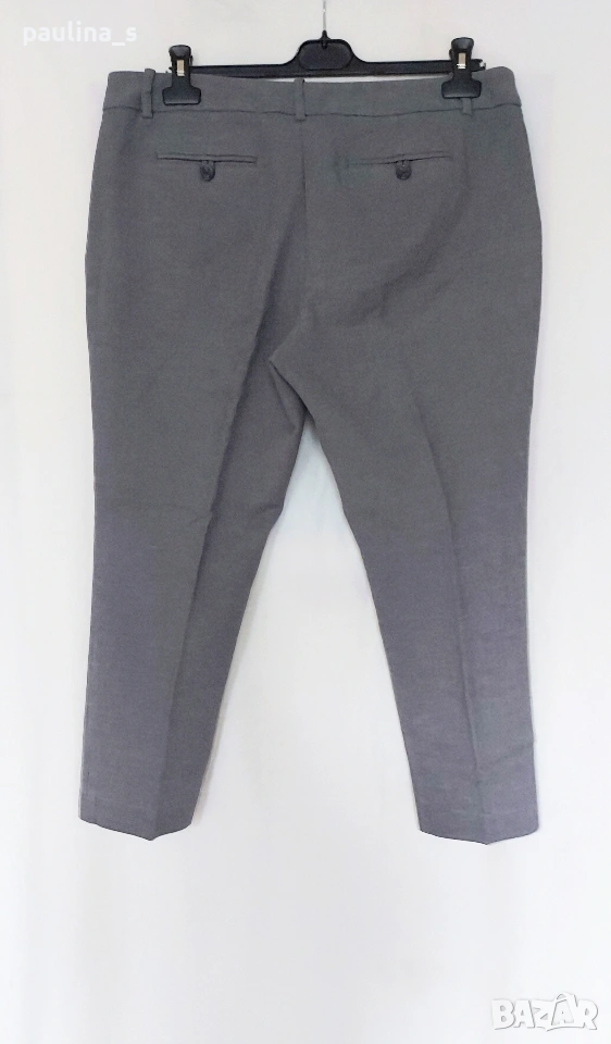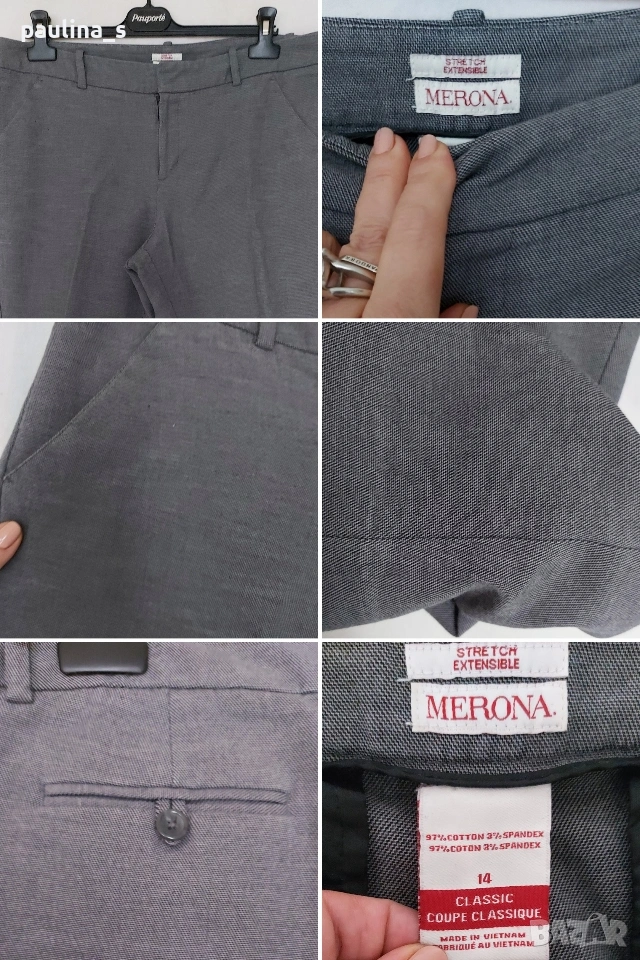 1️⃣. L / 2XL - "Merona". Цената е крайна, без пазарлъци 35 евро. Дизайнерски дънков еластичен панталон от памук и ликра, доста еластичен и покрива няколко номера, плътен Пепит Деним. Десенът е много дребен пепит в черно и бяло, отдалече изглежда сиво. Моделът е семпъл, съобразено с размера, изработката е на ниво, класата на дизайнерския бранд си личи. Подходящ е за повод или офис, за хладно време. Не е чисто нов, но е без дефекти. Реална цена 95 евро, моята цена е 35 евро