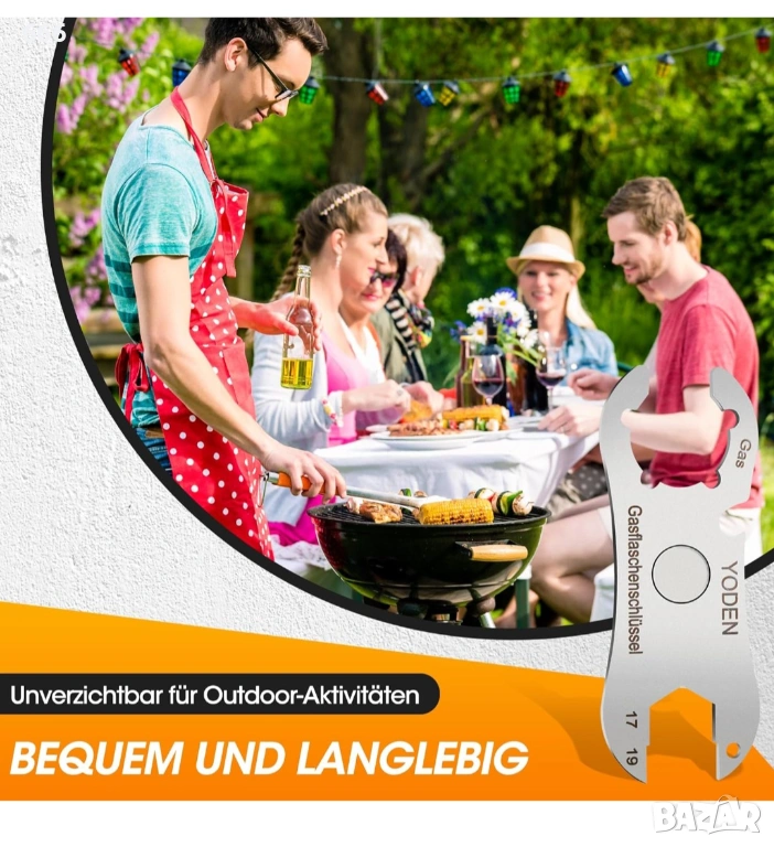 Идея за подарък: Нашият ключ за газови бутилки може да се използва на различни места и в различни ситуации. Ключът от неръждаема стомана за газови бутилки е идеален подарък за любителите на барбекю, лодка или кемпер/каравана. С нашия ключ за газови бутилки винаги сте готови да свържете газови бутилки или регулатори на налягането без никакви проблеми.