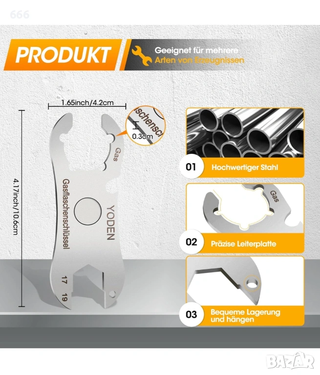 Ключ за газови бутилки от неръждаема стомана: с ключа за газови бутилки покривате стандартните размери на гаечните ключове 17 и 19 мм, всеки детайл е внимателно проверен, за да ви позволи лесно и лесно отваряне и затваряне на газови бутилки, оптималното решение за газова бутилка.