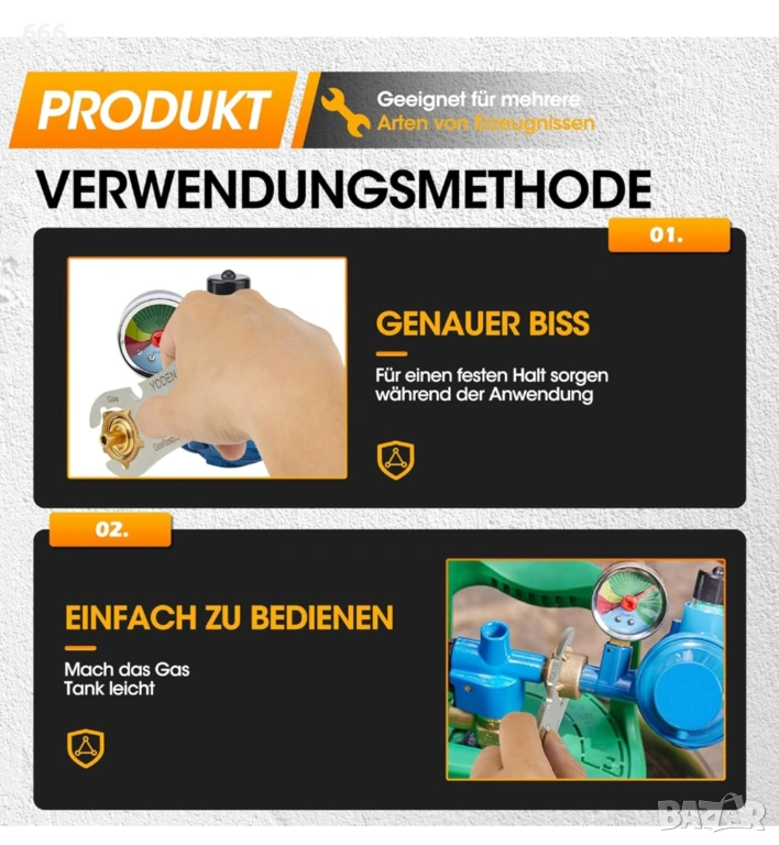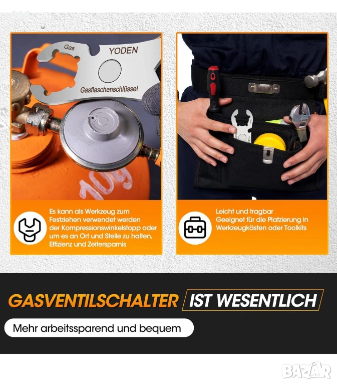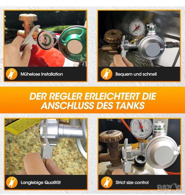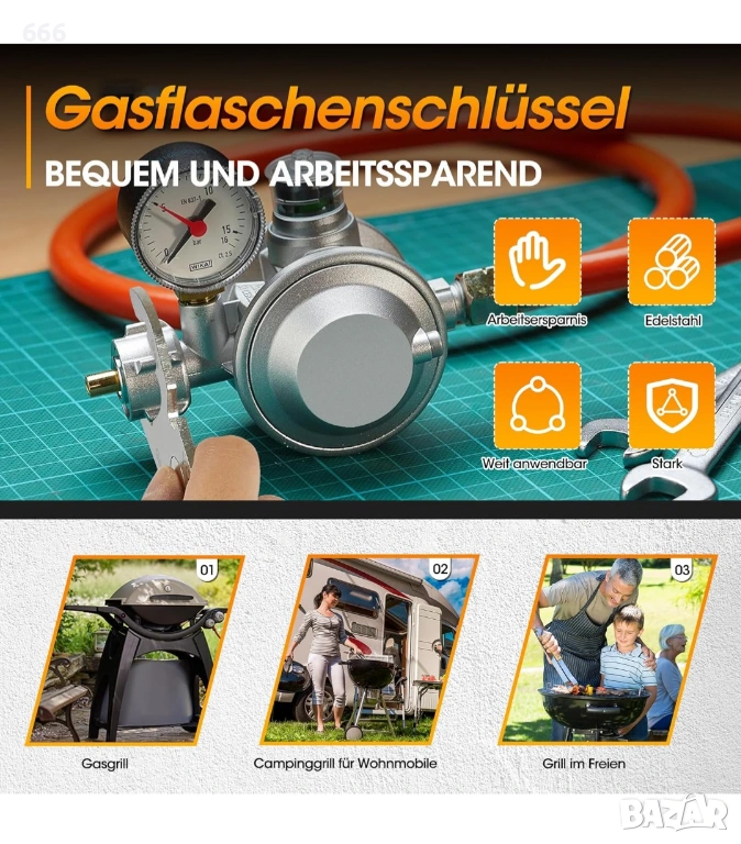 Многофункционален ключ за газови бутилки: нашият ключ за газови бутилки от неръждаема стомана с вграден отварач за бутилки, с който можете да отваряте и затваряте 99% от всички газови бутилки с тегло 11 кг или 5 кг бързо и безопасно.