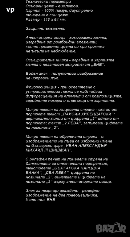 Микро-текст на лицевата страна - вляво от портрета текст "ПАИСИЙ ХИЛЕНДАРСКИ"; вертикални линии от цифрата "2" вдясно от портрета; текст "2 ЛЕВА", запълващ цифрата на номинала "2".