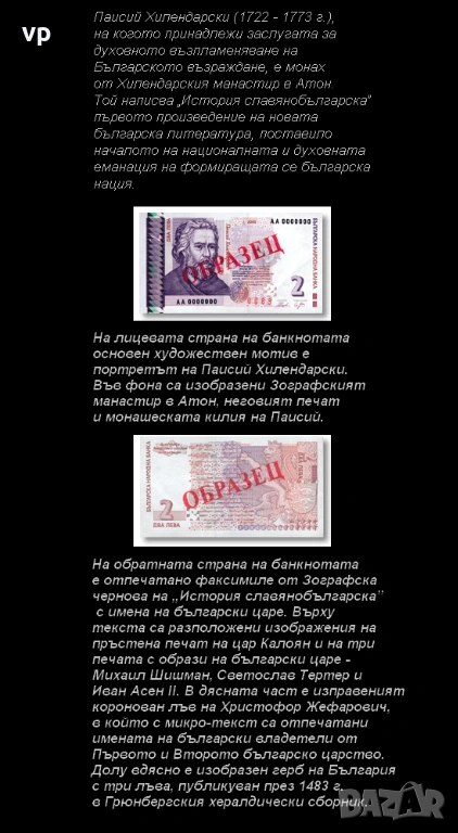 Продавам колекционерска, непрегъвана, чисто нова и неизползвана банкнота от 2 лева, 2005 г. с Паисий Хилендарски (1722 -1773 г.), серия- БЩ.