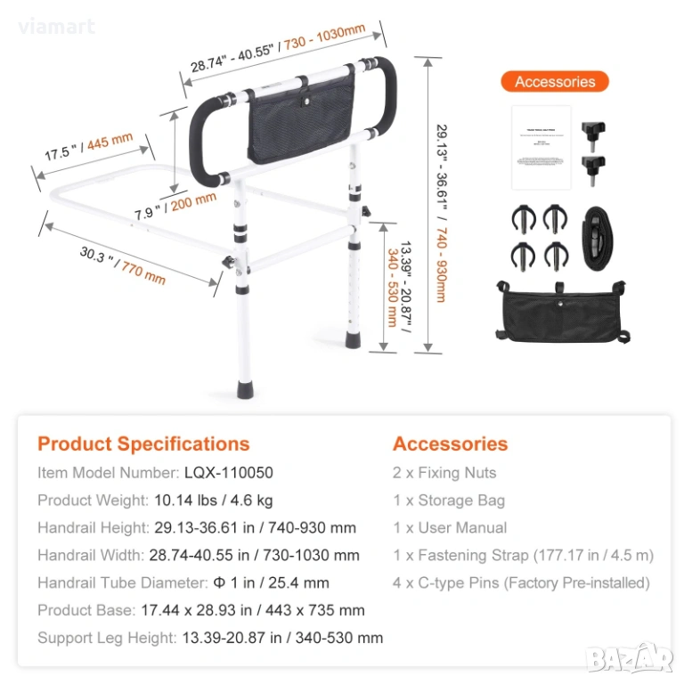 Изработен от високоякостна въглеродна стомана, с две стабилни опорни крака и допълнителен фиксиращ колан под матрака, парапетът осигурява отлична стабилност и спокойствие всеки ден. Благодарение на 180° сгъваемия дизайн, той може лесно да се прибере, когато не се използва, без да заема излишно място. Регулируемата дръжка в 4 нива позволява перфектно напасване според ръста и нуждите на потребителя.