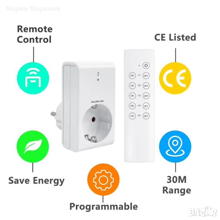 Безжични контакти с дистанционно управление комплект за домакински уреди – 5 контакта Бели, снимка 1 - Други стоки за дома - 53293630 Безжични контакти с дистанционно управление комплект за домакински уреди – 5 контакта Бели, снимка 2 - Други стоки за дома - 53293630 Безжични контакти с дистанционно управление комплект за домакински уреди – 5 контакта Бели, снимка 3 - Други стоки за дома - 53293630 1/3