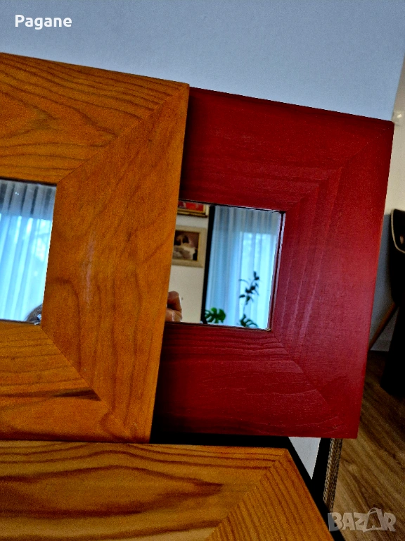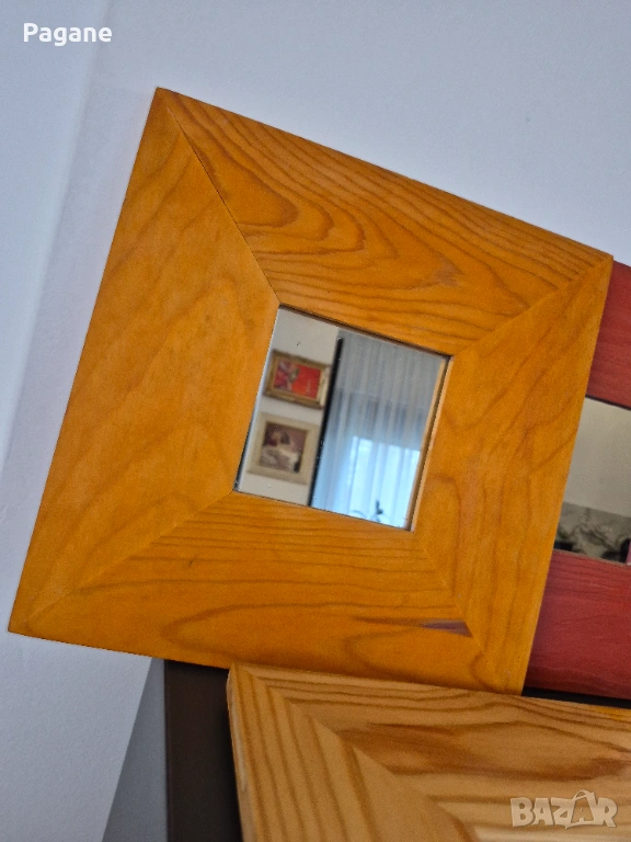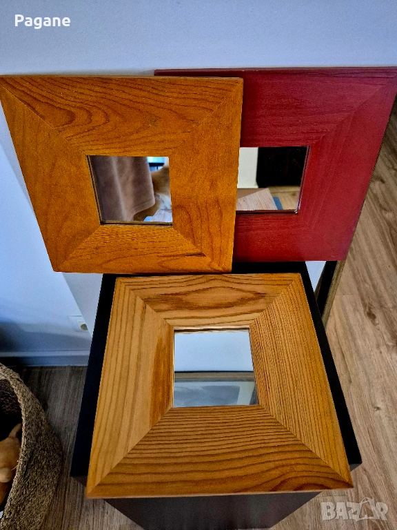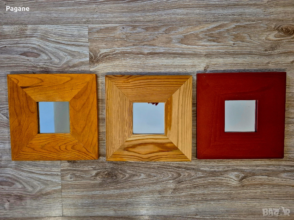 Продавам комплект от три уникални квадратни огледала с широки рамки от естествено дърво. Огледалата са с различен финиш, което позволява интересни комбинации при окачване на стена (в редица, стъпаловидно или в триъгълник).