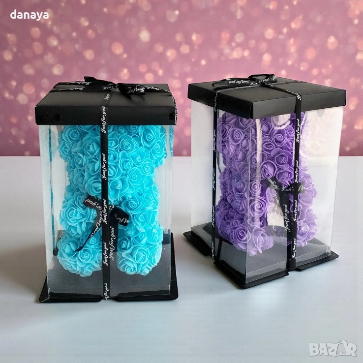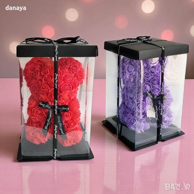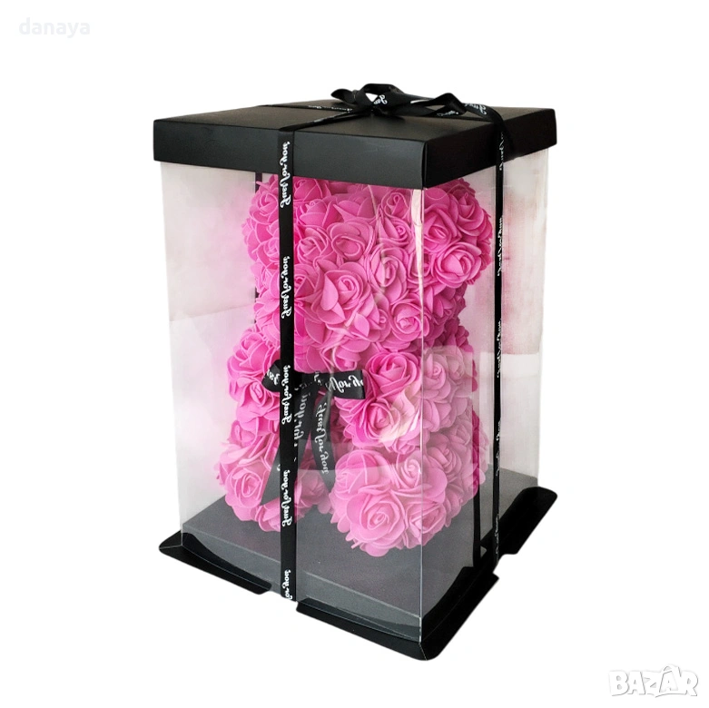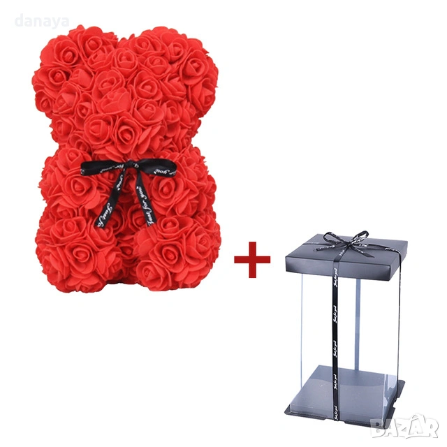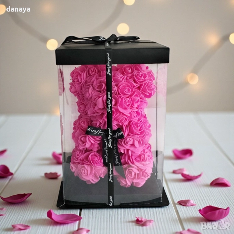Декоративното мече е изработено изцяло от рози, подредени ръчно във форма на плюшено мече, което създава силно емоционално въздействие още от първия поглед. Поставено е в елегантна прозрачна кутия с капак и декоративна панделка, което превръща продукта в напълно завършен подарък, готов за поднасяне без допълнително опаковане.